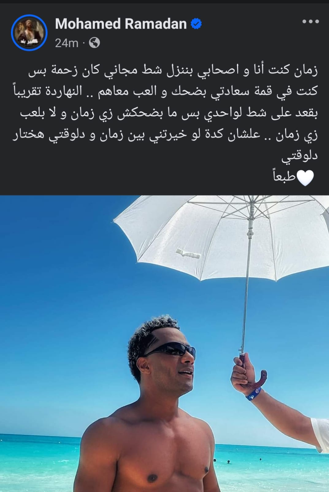 وعلق محمد رمضان قائلا : "زمان كنت أنا وأصحابي بننزل شط مجاني كان زحمة بس كنت في قمة سعادتي بضحك وألعب معاهم".