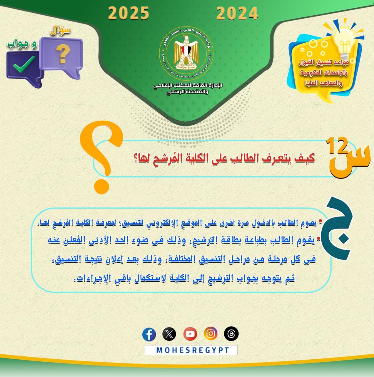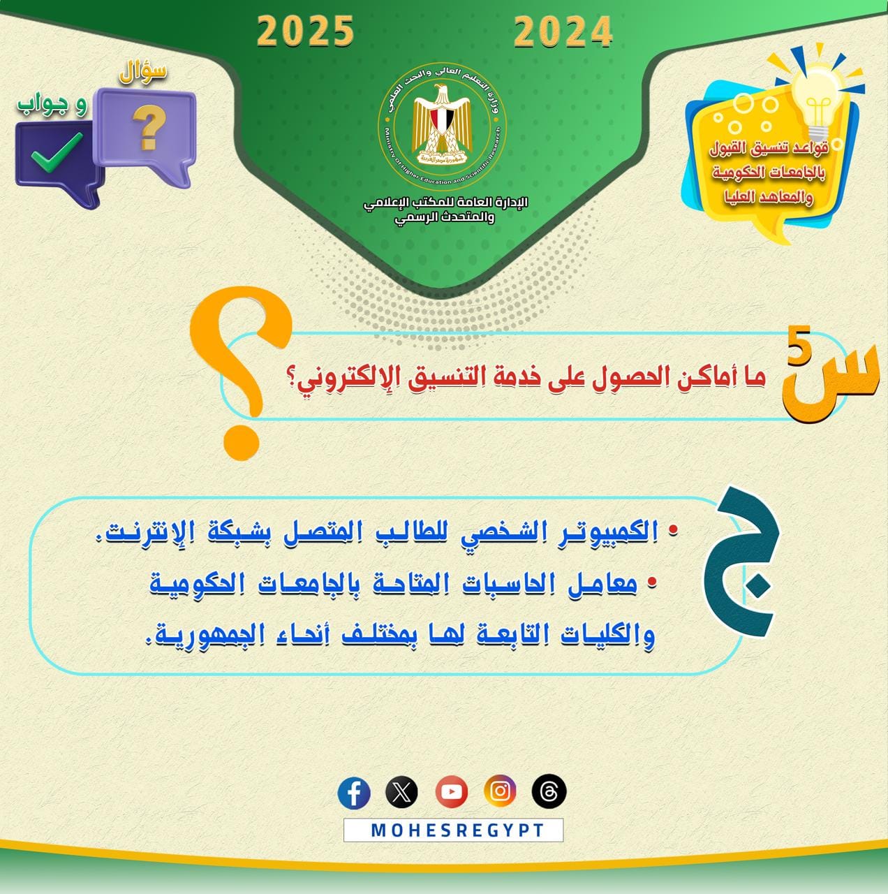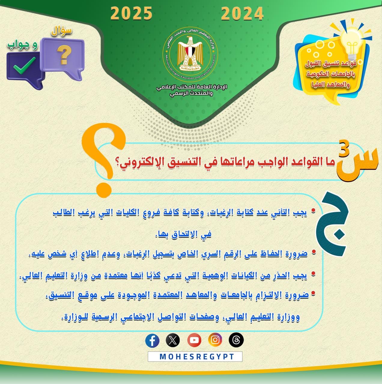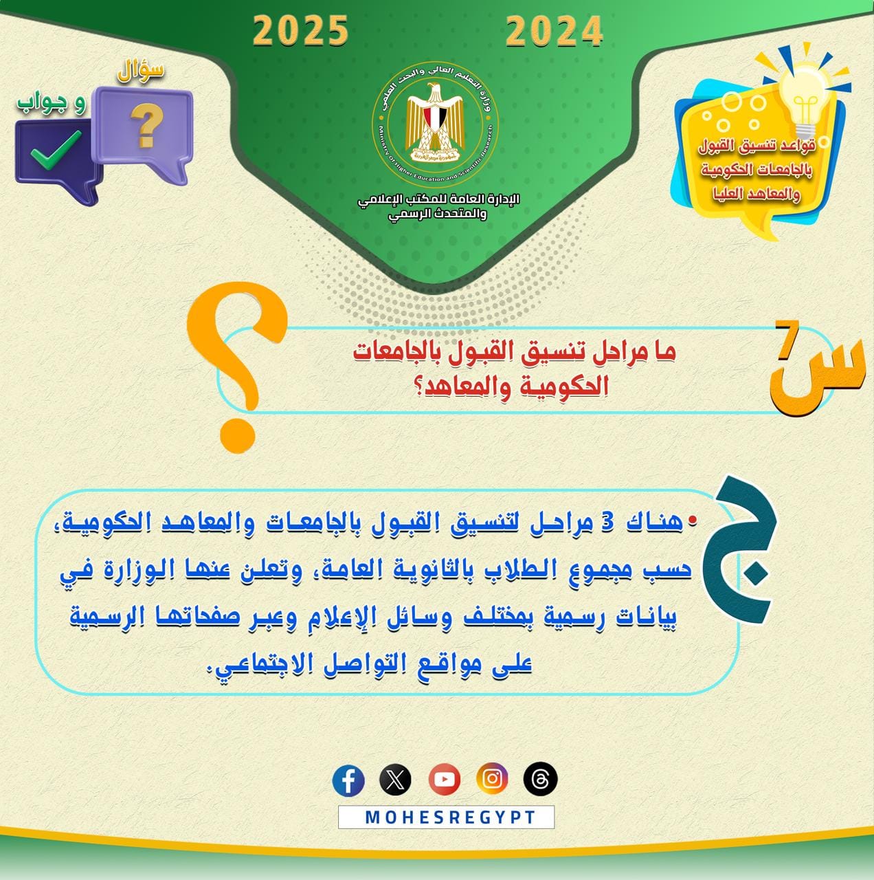 "سؤال وجواب".. انفوجرافات حول تنسيق القبول بالجامعات الحكومية والمعاهد لطلاب الثانوية العامة