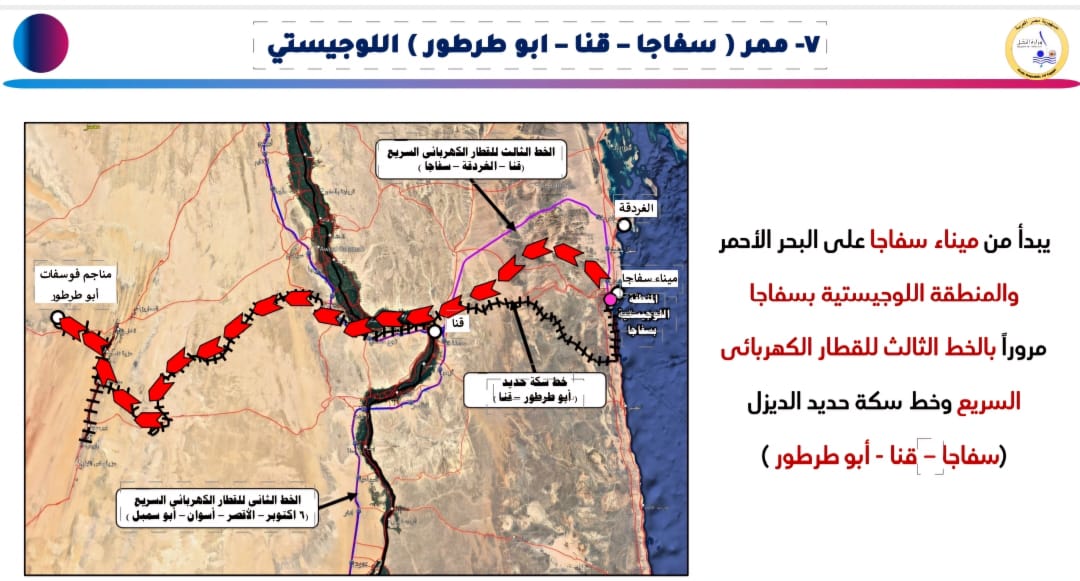 في إطار خطة الدولة للتنمية المستدامة 2030 و تنفيذاً لتوجيهات فخامة الرئيس عبدالفتاح السيسي رئيس الجمهورية بتحويل مصر الى مركز اقليمي للنقل واللوجستيات وتجارة الترانزيت و تطوير منظومة النقل على مستوى الجمهورية و لتحقيق هذا الهدف فإنه تم التخطيط لإنشاء عدد 7 ممرات لوجستية متكاملة جاري تنفيذها لربط مناطق الإنتاج (الصناعي – الزراعي – التعديني) بالموانئ البحرية أو ربط الموانئ البحرية على البحر الأحمر بالموانئ البحرية على البحر المتوسط وخدمة المجتمعات العمرانية الجديدة بواسطة شبكة من السكة الحديدية (ديزل / قطار كهربائي سريع) أو شبكة الطرق الرئيسية مروراً بالموانئ الجافة والمناطق اللوجستية الواقعة على هذه الممرات