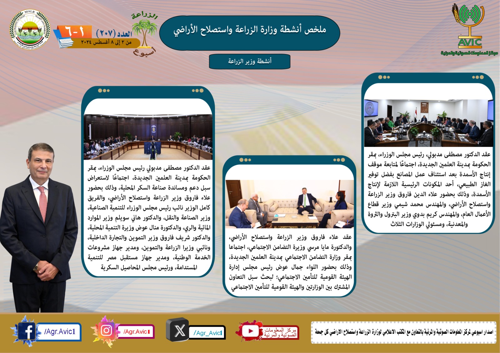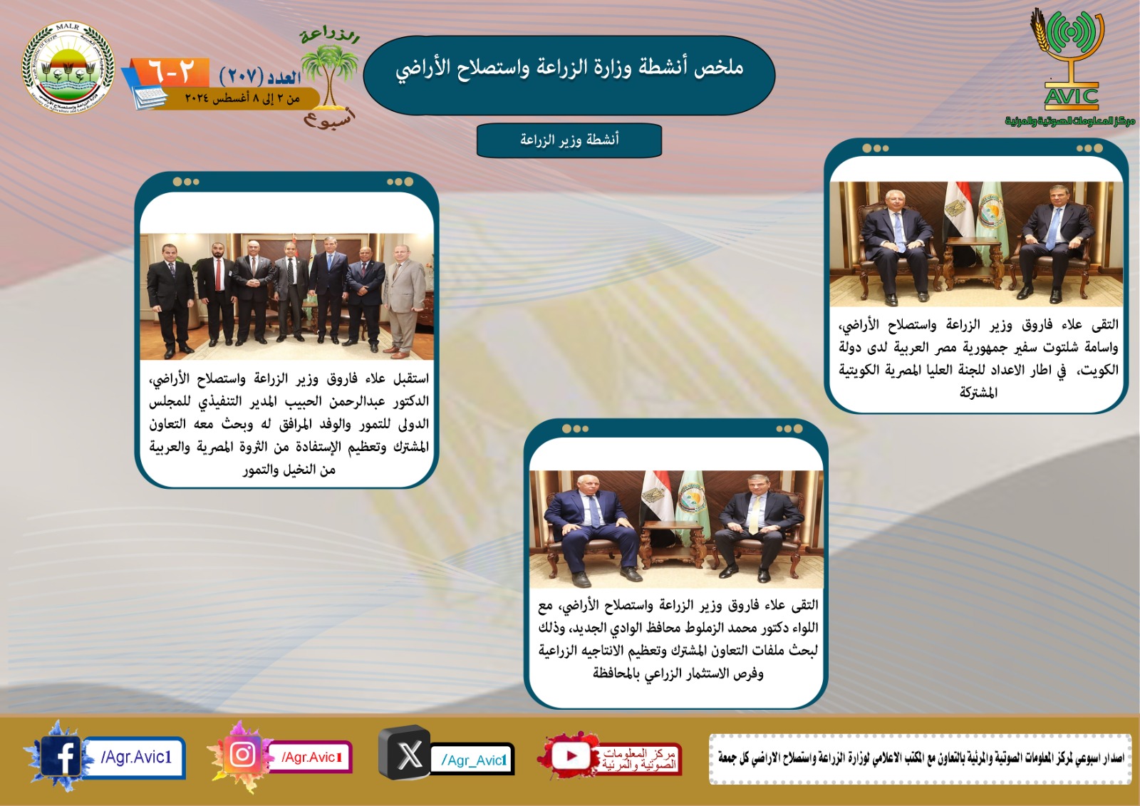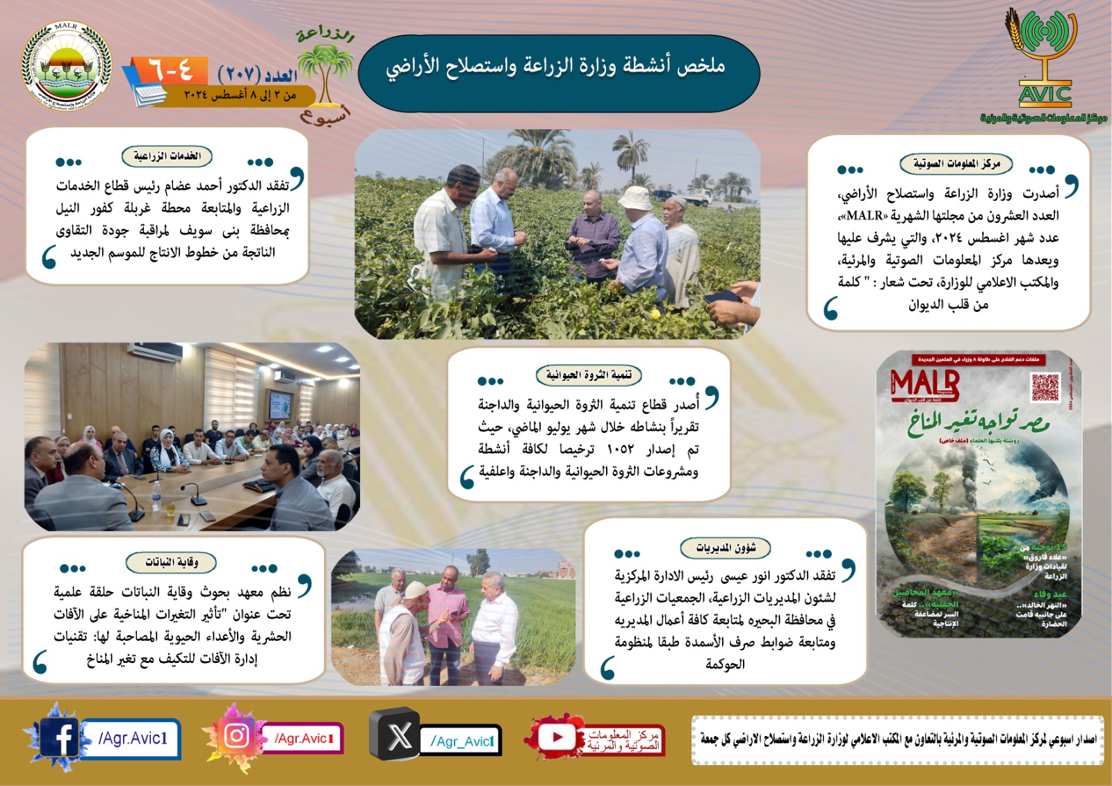 أصدر مركز المعلومات الصوتية والمرئية، التابع لوزارة الزراعة واستصلاح الاراضي، "الانفوجراف الاسبوعي" في نسخته رقم ٢٠٧ حول الحصاد الاسبوعي لأهم أنشطة الوزارة، خلال الاسبوع الماضي في الفترة من ٢ وحتى ٨ اغسطس الجاري، وذلك بالتعاون مع المكتب الاعلامي للوزارة، كما أصدر المركز ايضا ملخصا بالفيديو، حول انشطة الوزارة خلال نفس الفترة.