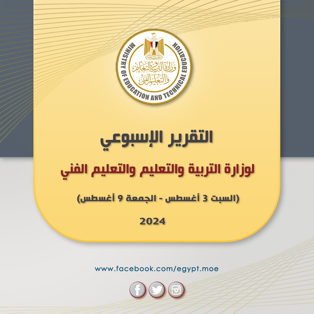 أصدر المركز الاعلامى لوزارة التربية والتعليم والتعليم الفنى التقرير الأسبوعى للوزارة خلال الفترة من السبت ٣ أغسطس - الجمعة ٩ أغسطس) ويتضمن ما يلى :