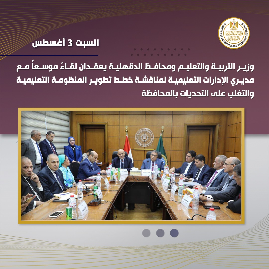 عقد محمد عبد اللطيف وزير التربية والتعليم والتعليم الفنى واللواء طارق مرزوق محافظ الدقهلية، لقاءًا مع عدد من قيادات الوزارة، ومديري ووكلاء الإدارات التعليمية بالمحافظة؛ لمناقشة القضايا والمشكلات والخطط المستقبلية لتطوير المنظومة التعليمية في المحافظة، فضلا عن بحث كافة المقترحات المتعلقة بسبل مواجهة الكثافات الطلابية وعجز المعلمين.