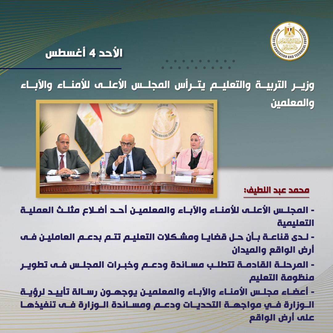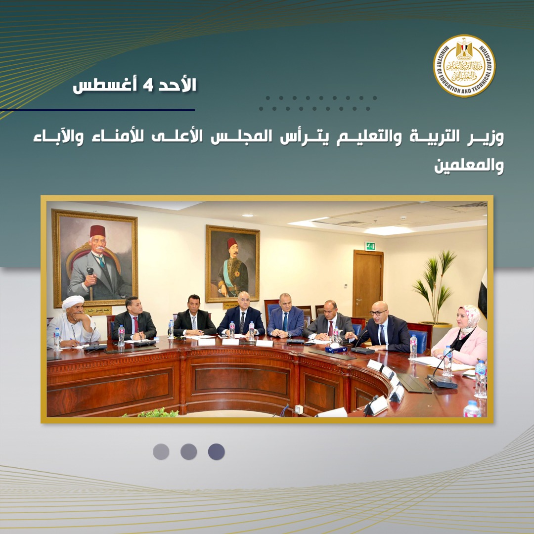 ترأس محمد عبد اللطيف وزير التربية والتعليم والتعليم الفني، الأحد، اجتماع المجلس الأعلى للأمناء والآباء والمعلمين على مستوى الجمهورية؛ لاستعراض ومناقشة عدد من المحاور المتعلقة بتطوير منظومة التعليم قبل الجامعي.