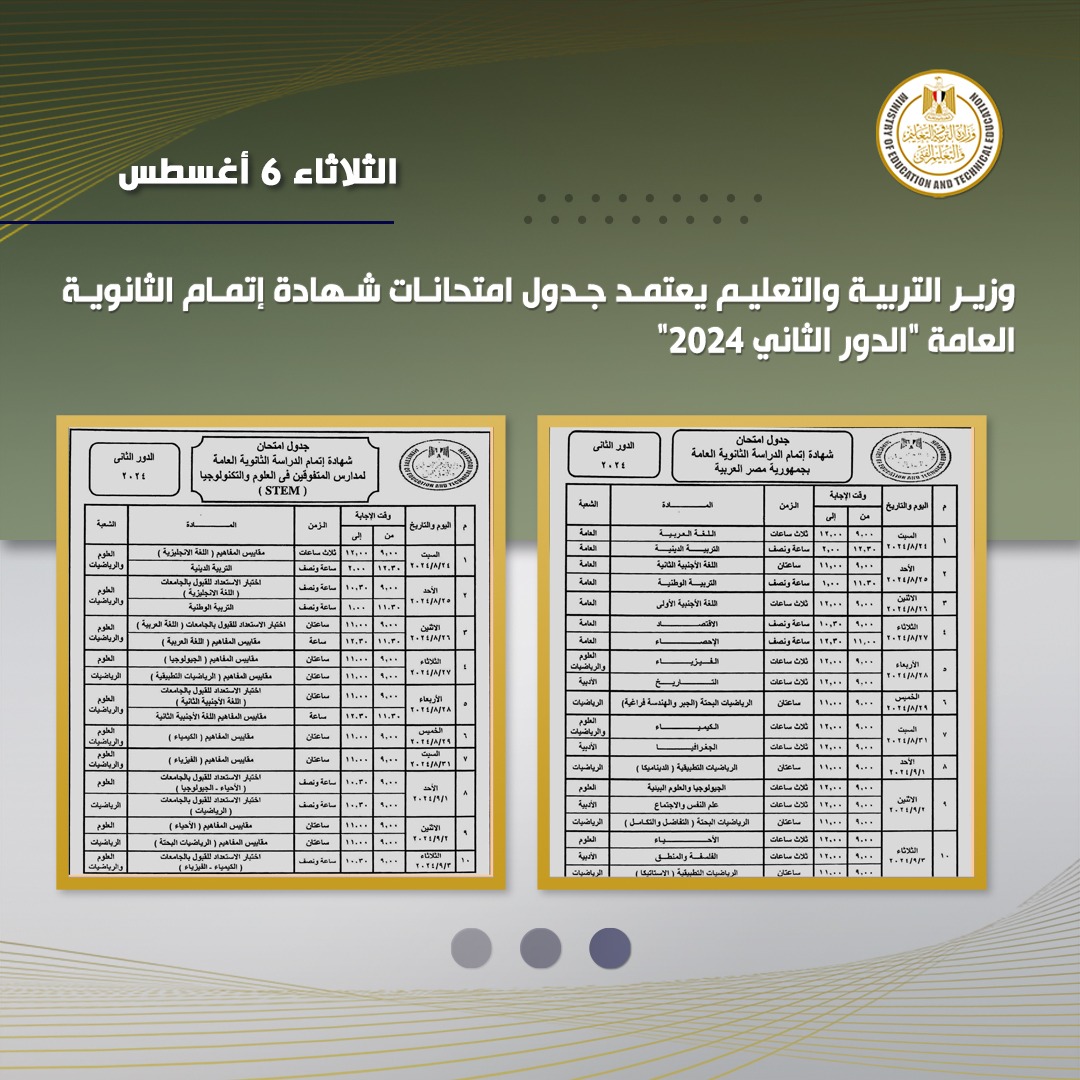 اعتمد محمد عبد اللطيف وزير التربية والتعليم والتعليم الفني جدول امتحانات الدور الثاني لامتحانات الثانوية العامة، ومدارس المتفوقين في العلوم والتكنولوجيا (STEM) للعام الدراسى 2023 / 2024 والتى من المقرر أن تبدأ يوم السبت الموافق 24 أغسطس 2024 وتنتهى يوم الثلاثاء الموافق 3 سبتمبر 2024.