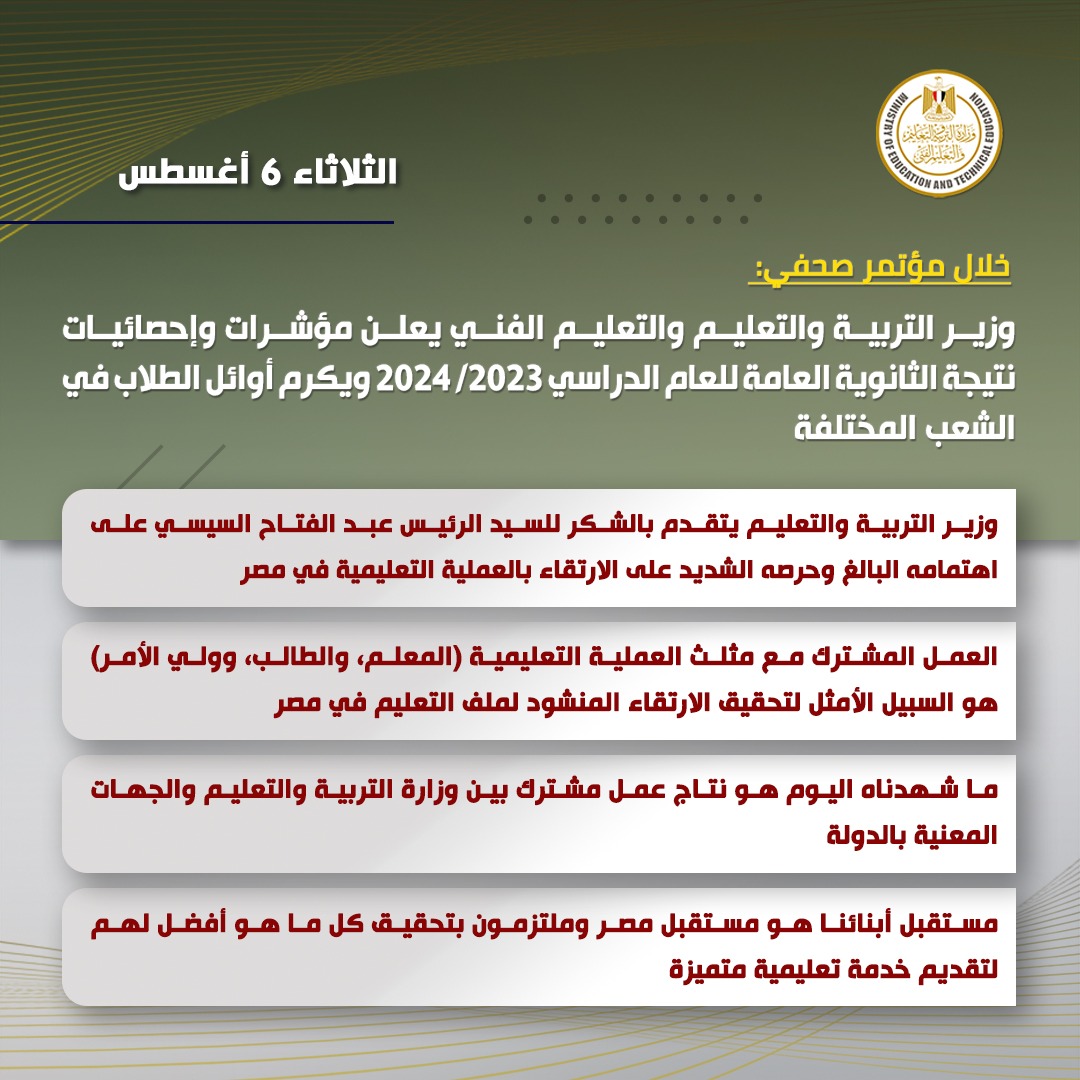 كما توجه الوزير بتحية تقدير واحترام لكل أسرة مصرية تحملت الكثير لمساندة ابنائها وبناتها خلال فترة دراستهم، وتقدم بخالص التهنئة للطلاب الناجحين على تفوقهم وحثهم على بذل المزيد من الجهد في حياتهم المقبلة.