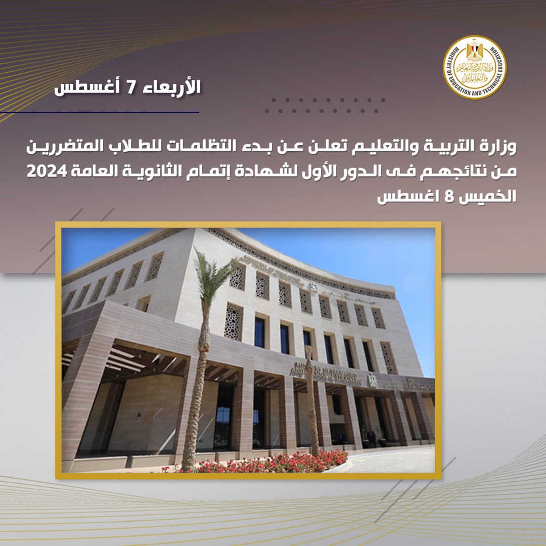 أعلنت وزارة التربية والتعليم والتعليم الفنى بدء التظلمات لطلاب الثانوية العامة المتضررين من نتائجهم بامتحان الدور الأول لشهادة اتمام الدراسة الثانوية العامة للعام الدراسى 2023 / 2024؛ اعتباراً من يوم غد الخميس الموافق 8 / 8 / 2024. وقد تقرر فتح باب التظلمات من نتائج امتحان الدور الأول لمدة (خمسة عشر يوماً) تبدأ اعتباراً من غد يوم الخميس الموافق 8 / 8/ 2024 وحتى يوم الخميس الموافق 22 / 8 / 2024 على أن تبدأ اجراءات الاطلاع بالمقرات المحددة اعتباراً من يوم الأحد الموافق 11 /8 / 2024.