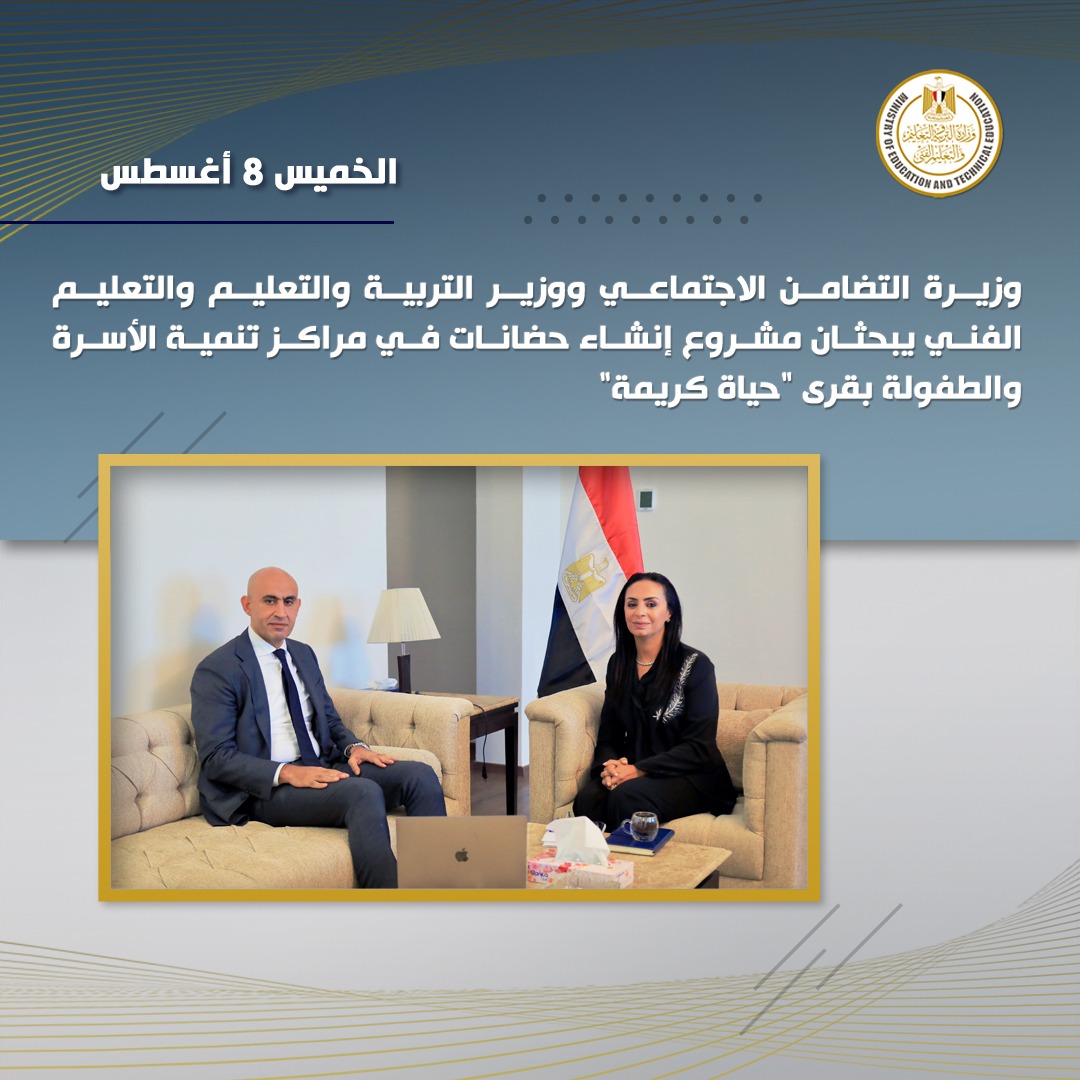التقت الدكتورة مايا مرسي وزيرة التضامن الاجتماعي السيد محمد عبد اللطيف وزير التربية والتعليم والتعليم الفني، ومسئولي شركات "سيرا" للتعليم و"الدولية" للنظم التعليمية و"إينوفت" للتعليم؛ لمناقشة مشروع إنشاء وإدارة عدد من الحضانات والفصول الدراسية للفئة العمرية من صفر – ٦ سنوات، في عدد ١٠٨ مراكز لتنمية الأسرة والطفولة في قرى مبادرة السيد رئيس الجمهورية لتطوير الريف المصري "حياة كريمة" على مستوى الجمهورية.