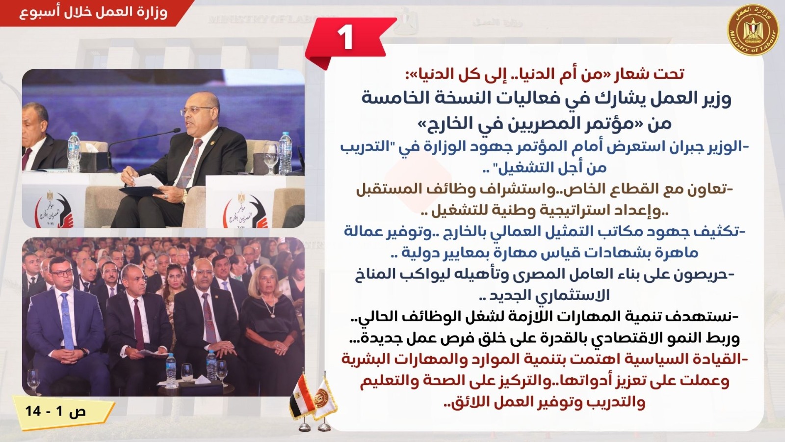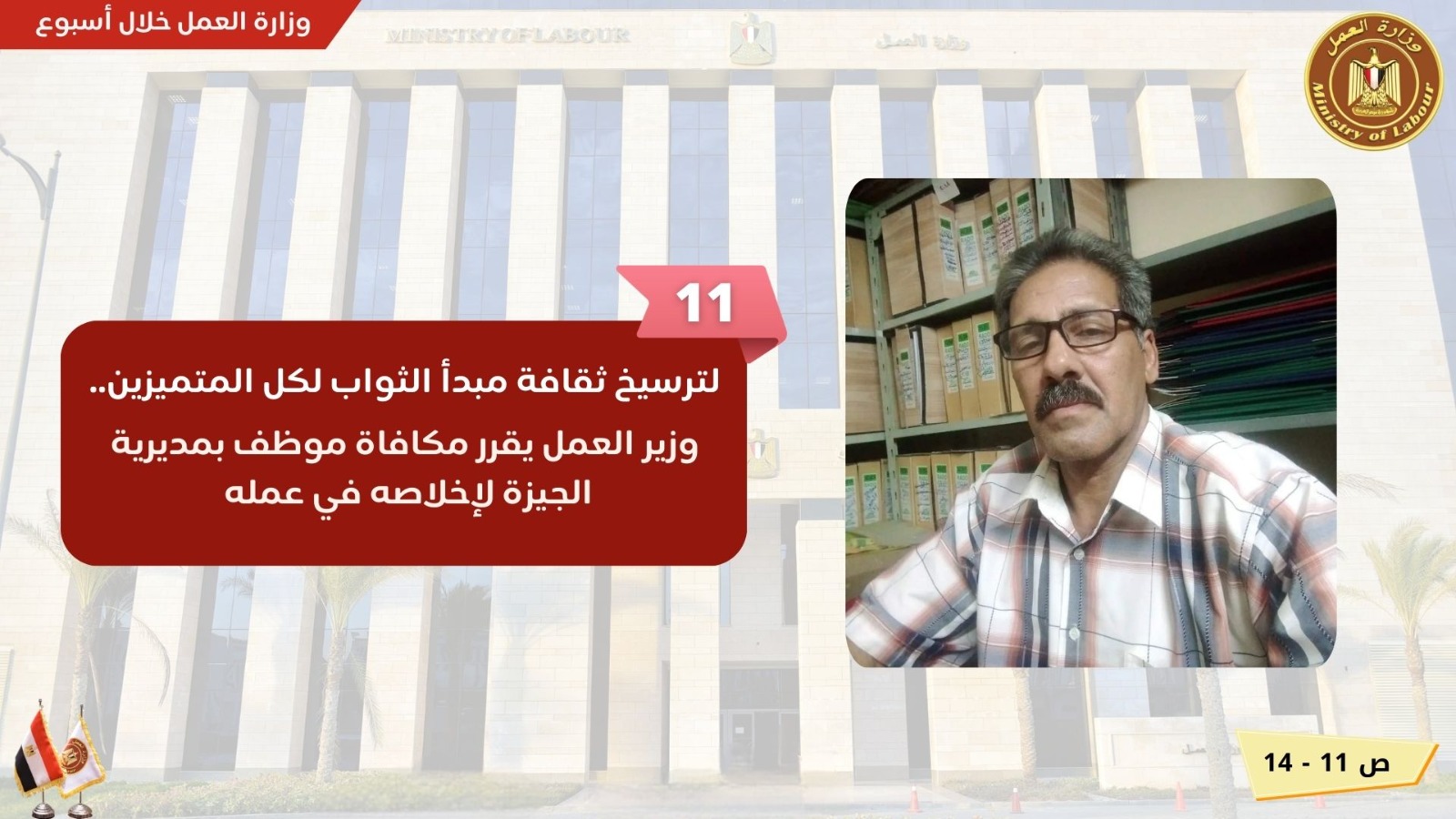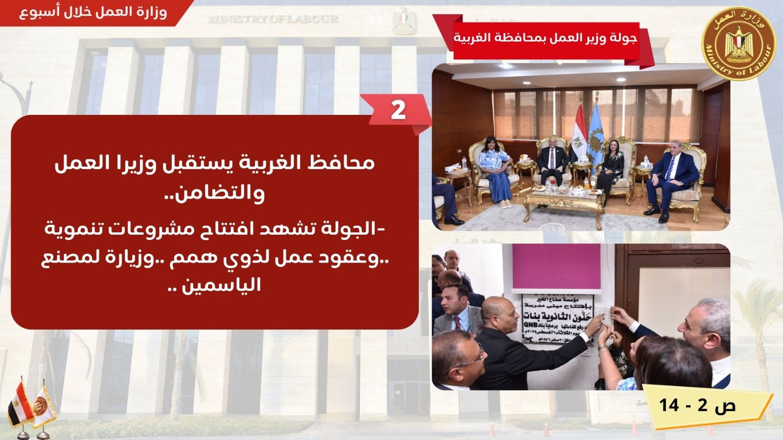 أصدرت وزارة العمل اليوم السبت "إنفوجراف " بشأن نشاط الوزارة خلال الـ 7 أيام الماضية، والذي بدأ بجولة في محافظة الغربية ..حيث استقبل اللواء اشرف الجندي محافظ الغربية، بديوان عام "المحافظة"، بمدينة طنطا، السيد محمد جبران وزير العمل، ود. مايا مرسى وزيرة التضامن الإجتماعي، والسفيرة نبيلة مكرم، رئيس الأمانة الفنية للتحالف الوطني للعمل الأهلي التنموي، ود. مصطفى زمزم رئيس مجلس أُمناء مؤسسة صناع الخير للتنمية ،عضو مجلس امناء التحالف الوطنى .