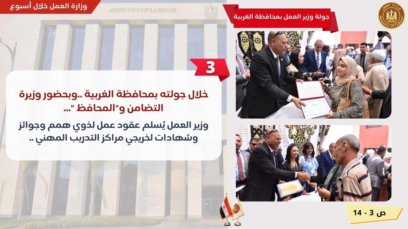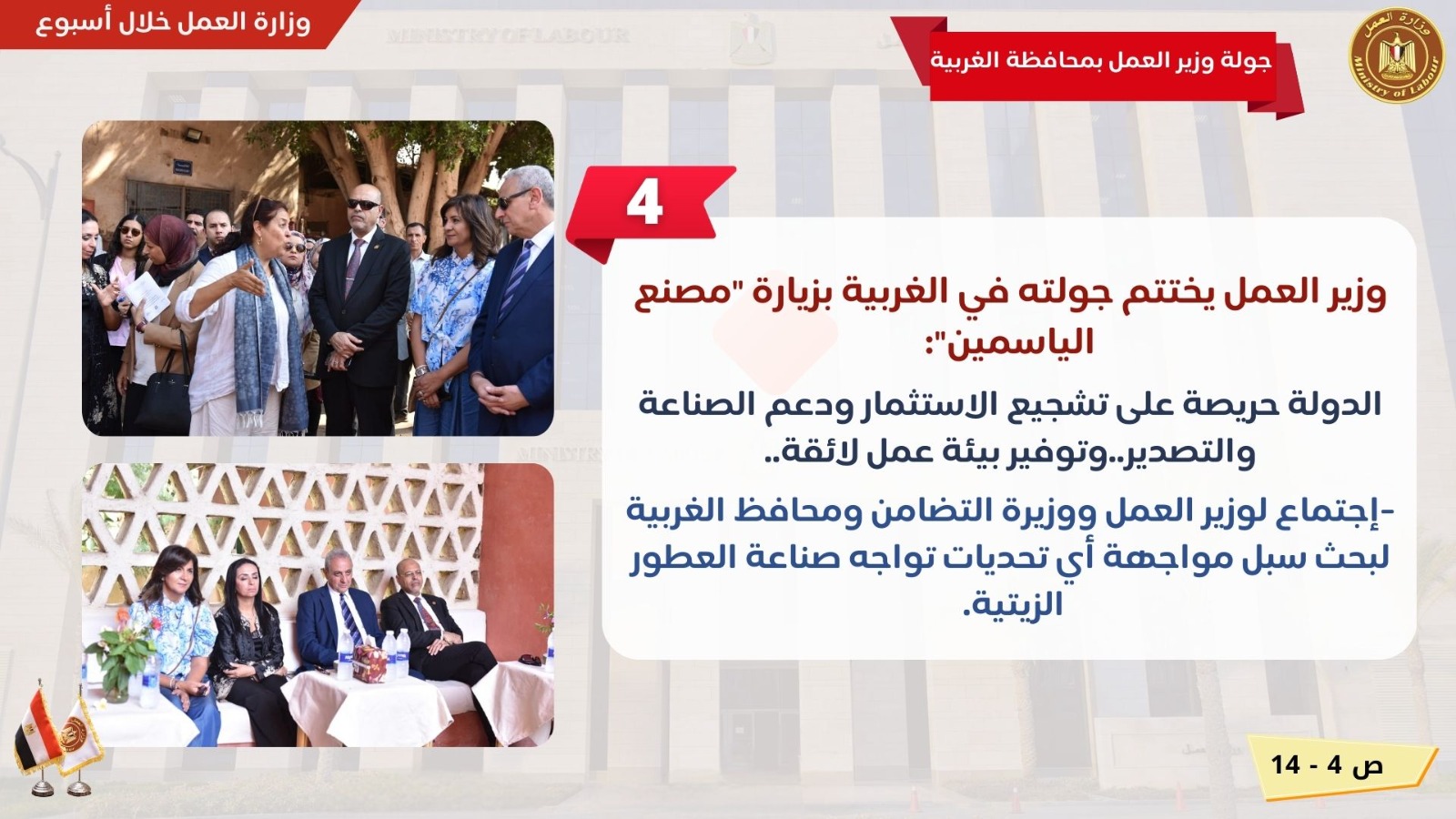 الحصاد بالانفوجراف.. وزارة العمل في 7 أيام .. جولة في محافظة الغربية لتسليم عقود عمل لذوي همم وشهادات تدريب مهني.. وإزالة كافة العقبات أمام صناعة الياسمين والعطور الزيتية