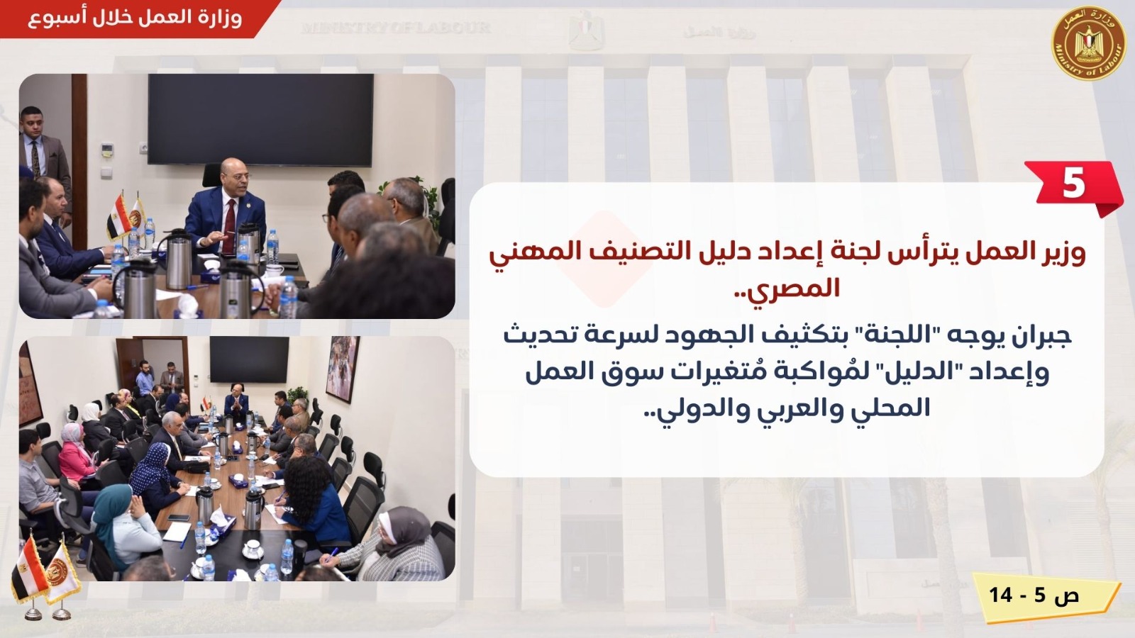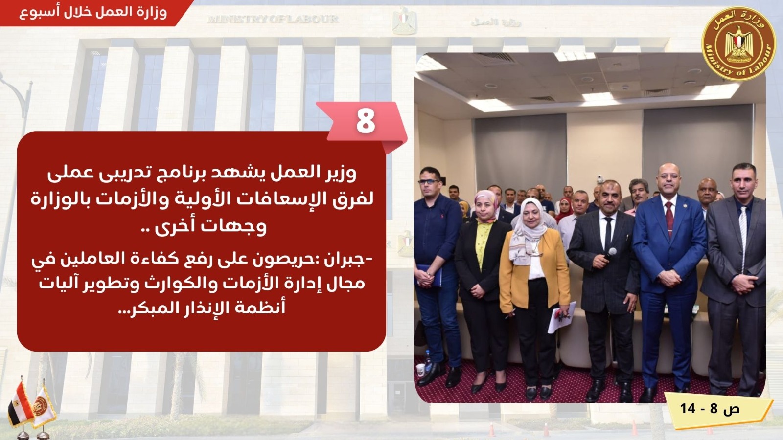 كما شهد وزير العمل، بديوان عام الوزارة ، الدورة التدريبية للعاملين بإدارات الوزارة المختلفة ، واعضاء فريق التدخل السريع بوزارة التضامن الاجتماعي ، وعدد من العاملين بوزارة الخارجية ، بواقع 61 موظف ، حول الإسعافات الاولية ودور فرق التدخل ، والمنعقدة على مدار 5 أيام متتالية ..ووجه وزير العمل ، لجنة إعداد دليل التصنيف المهني المصري 2027،إلى تكثيف الجهود، واللقاءات ،لسرعة تحديث وإصدار النسخة الجديدة من "الدليل"، لمواكبة المُتغيرات التي طرأت على سوق العمل، وذلك برصد المِهن المُندثرة، والمِهن المُستحدثة ،وتوصيفها طبقًا للمعايير الدولية والعربية والمِهنية .