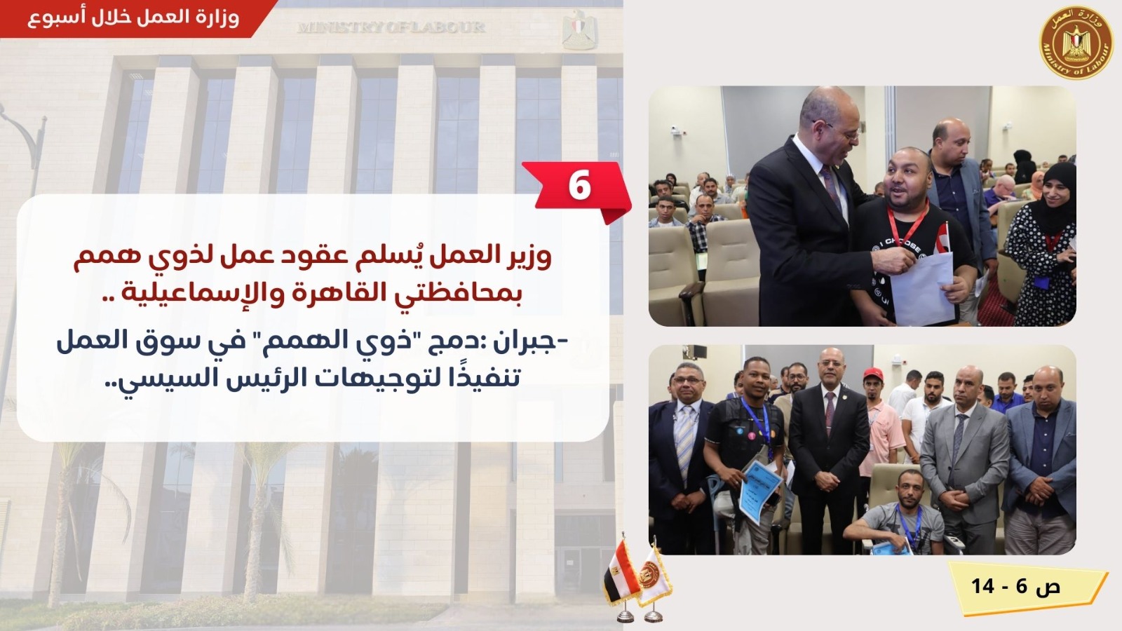 وخلال الأسبوع سَلّم جبران بمقر الوزارة بالعاصمة الادارية الجديدة عقود عمل لذوي همم ،من محافظتي القاهرة والإسماعيلية،بحضور قيادات مديريتي عمل "المحافظتين".. كما قرر وزير العمل ،مكافأة أحد العاملين بمديرية عمل الجيزة ،لتفانيه وإخلاصه في عمله.
