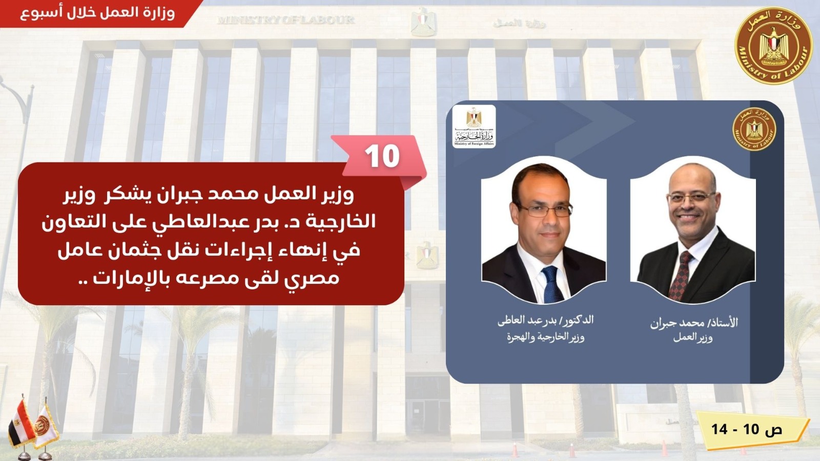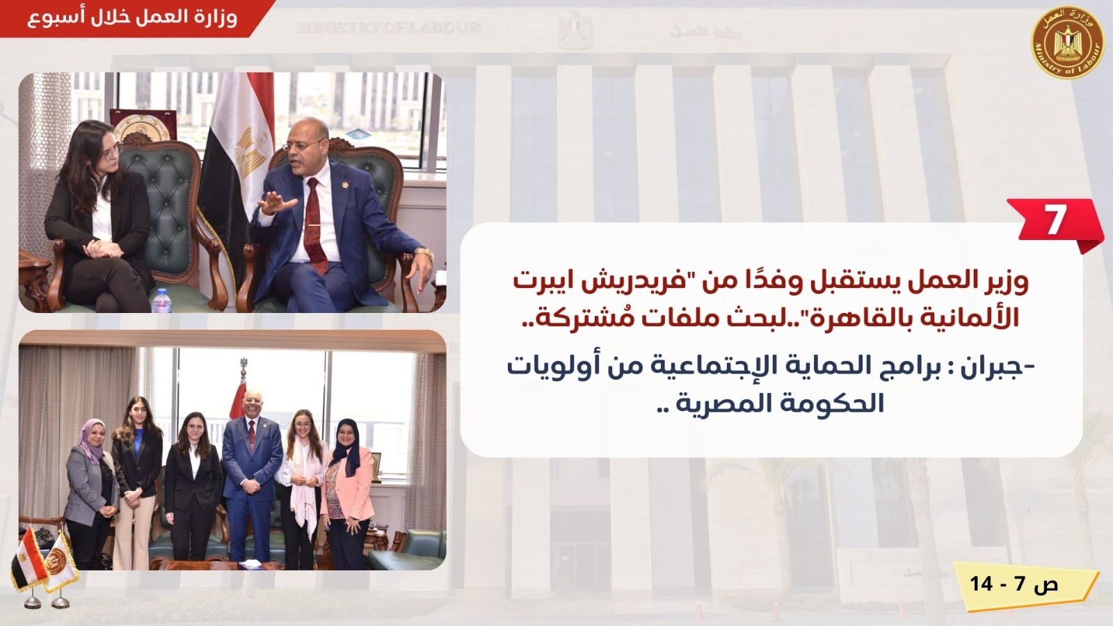 ووجه وزير العمل ،الشكر والتقدير ،الى د. بدر عبد العاطي وزير الخارجية والهجرة وشؤون المصريين بالخارج ، والقنصلية المصرية بدبي ،على التنسيق والتعاون ،والجهود المبذولة لإنهاء الإجراءات اللازمة، لنقل جثمان عامل مصري لقى مصرعه غرقًا بالإمارات ،الى أرض الوطن ..وخلال الأسبوع أيضًا إستقبل وزير العمل ، بديوان عام "الوزارة" بالعاصمة الإدارية الجديدة ،وفد من مؤسسة فريدريش ايبرت الألمانية بالقاهرة، الذي يضم رونيا شيفر الممثل المقيم للمؤسسة، وفرح غزال مدير برامج، وماريا ديلاسيجا من "المقر الرئيسي" .