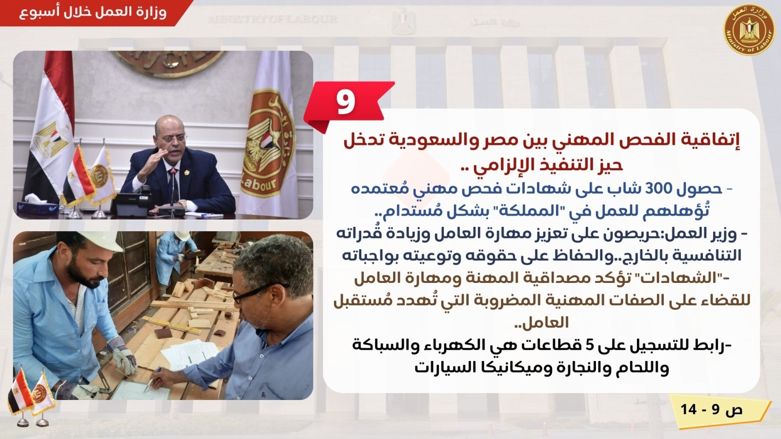 وأعلن وزير العمل ،عن حصول 300 شاب مصري على شهادات فحص مهني مُعتمدة، تؤكد إمتلاكهم المهارات اللازمة للعمل في المملكة العربية السعودية على 5 قطاعات هي :الكهرباء، والسباكة ،واللحام، والنجارة، وميكانيكا السيارات ..وأعلنت وزارة العمل ، عن 700 فرصة عمل جديدة ،لفتيات 15 محافظة ،من سن 18 إلى 35 سنة، وأصحاب المؤهلات العليا والمتوسطة ،ويمكن التقديم عليها ،من خلال الروابط ، خلال شهر أغسطس 2024 الجارى .