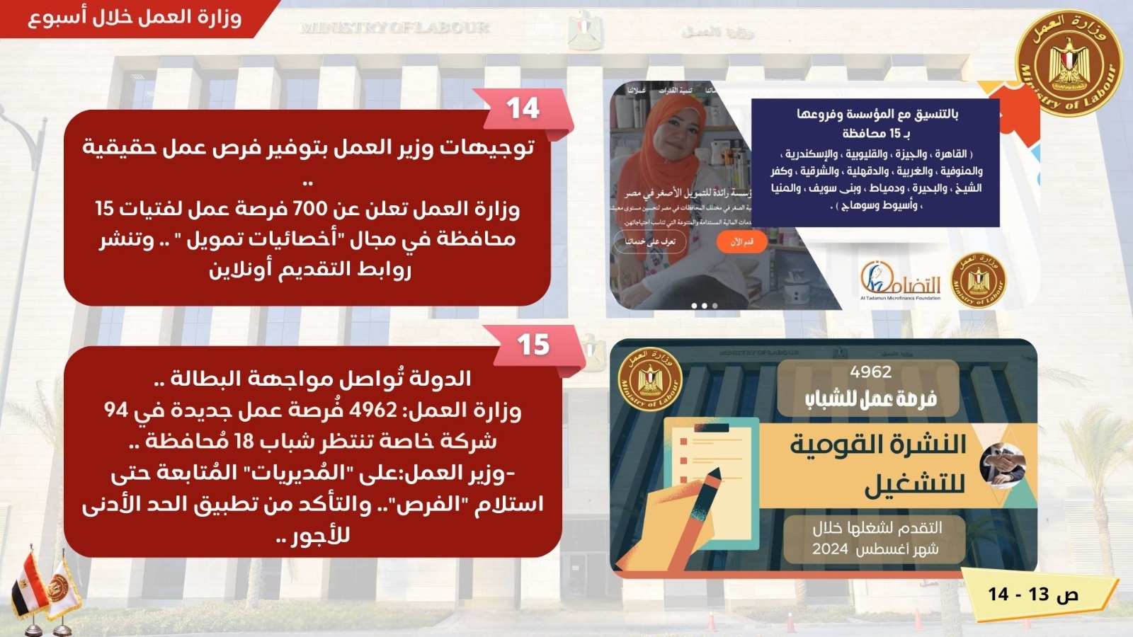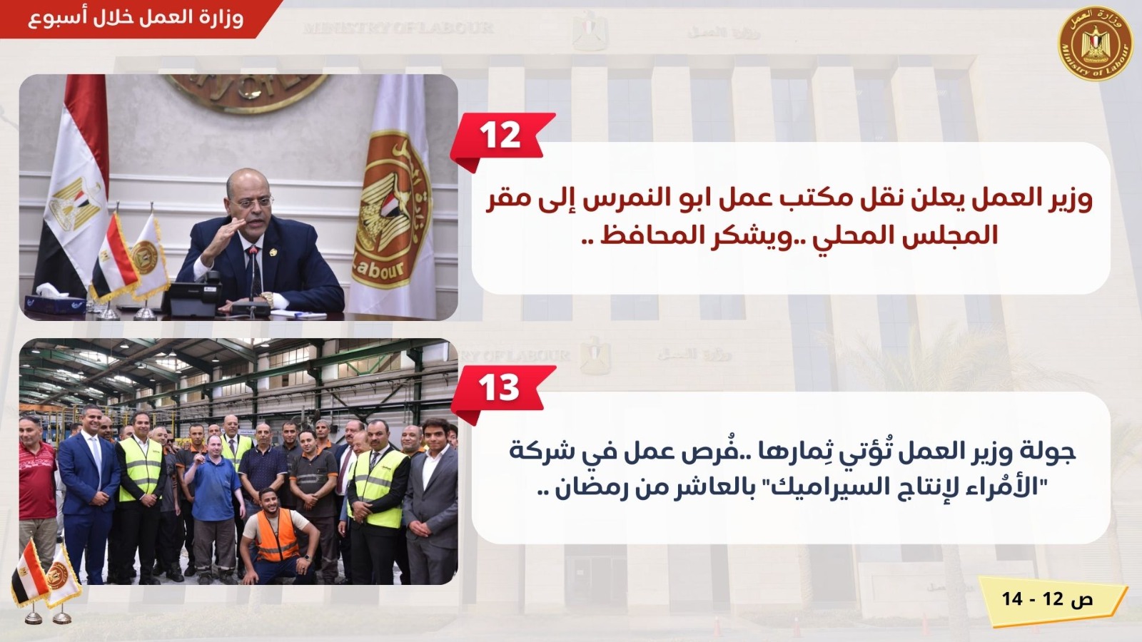 كما أعلن وزير العمل، عن عودة مكتب عمل ابو النمرس، بمحافظة الجيزة إلى المجلس المحلي للمدينة،وذلك لعدم جاهزية المقر الحالي لاستقبال الجمهور، وتقديم خدمات له على أكمل وجه ..وأصدرت وزارة العمل ، نشرة التوظيف نصف الشهرية ،التي تُعلن فيها عن فرص عمل جديدة في المحافظات تنسيقًا مع شركات القطاع الخاص .