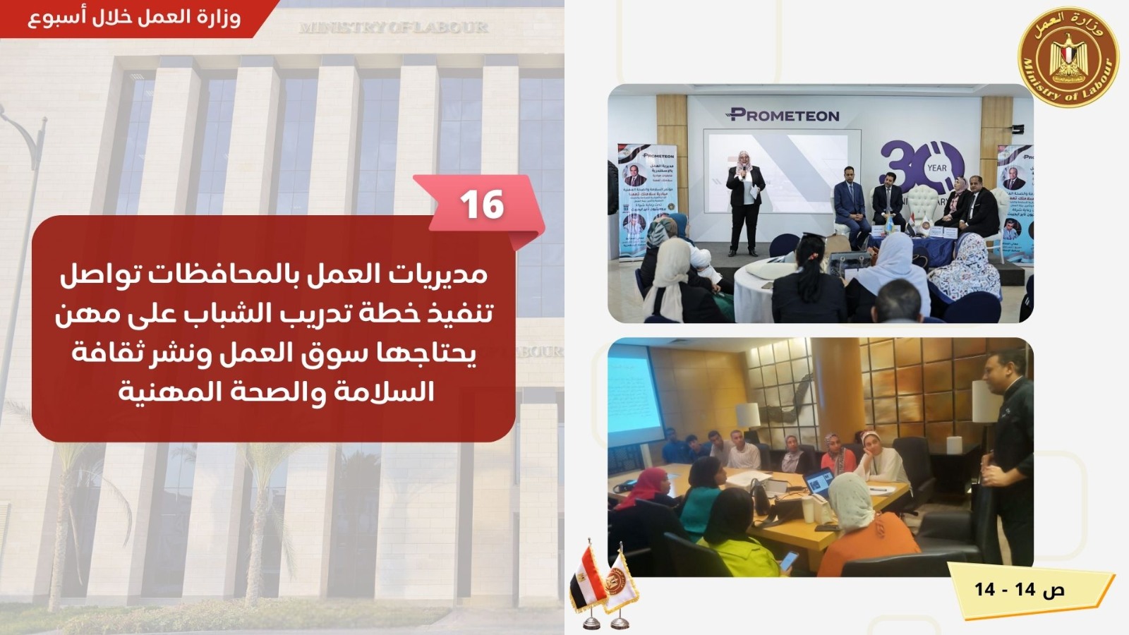 وإستمرت مديريات العمل بالمحافظات فى تنفيذ خطة الوزارة بشأن تدريب الشباب على مهن يحتاجها سوق العمل،وتوفير فرص العمل تنسيقا مع القطاع الخاص ، ونشر ثقافة السلامة والصحة المهنية، والتفتيش على المنشأت لتعزيز علاقات العمل بين صاحب العمل والعامل.