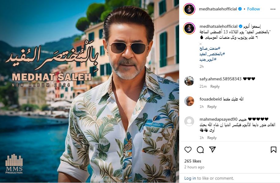الجدير بالذكر أن آخر أعمال المطرب مدحت صالح، هي أغنية «شهم ابن شهم»، الذي تعاون من خلالها مع الشاعر خالد تاج الدين، وطرحها خلال الفترة الماضية، عبر قناته على موقع الفيديوهات «يوتيوب»، ومختلف منصات الموسيقى الرقمية.