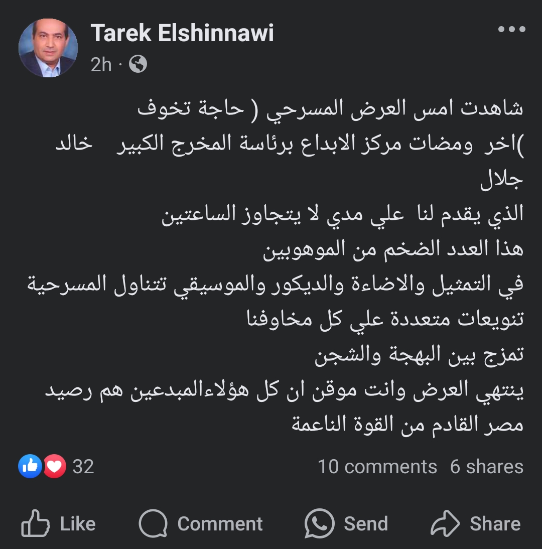 أشاد الناقد السينمائي الكبير طارق الشناوي بمسرحية "حاجة تخوف" والتي تعد من إخراج المخرج الكبير خالد جلال، وذلك عندما كتب منشور على صفحته الرسمية عبر موقع التواصل الاجتماعي "فيسبوك".
