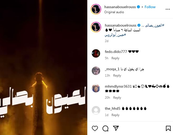 وكشف حسن أبو الروس، عبر حسابه الرسمي على «إنستجرام» عن موعد طرح العيون بصالي، قائلا: «العيون بصالي، السبت الساعة 6 مساءاً».