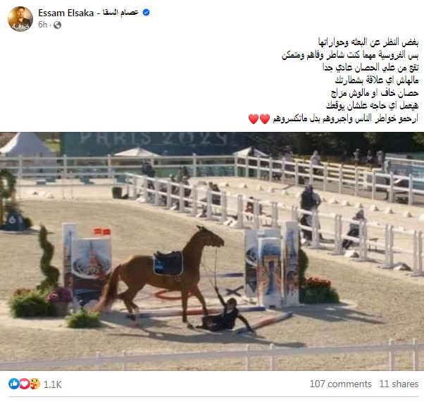 ونشر عصام السقا صورة لسلمى عبد المقصود من السباق وعلق عليها " بغض النظر عن البعثة وحواراتها،بس الفروسية مهما كنت شاطر و فاهم ومتمكن، تقع من علي الحصان عادي جدا، مالهاش اي علاقة بشطارتك ،حصان خاف أو مالوش مزاج ،هيعمل اي حاجه علشان يوقعك".