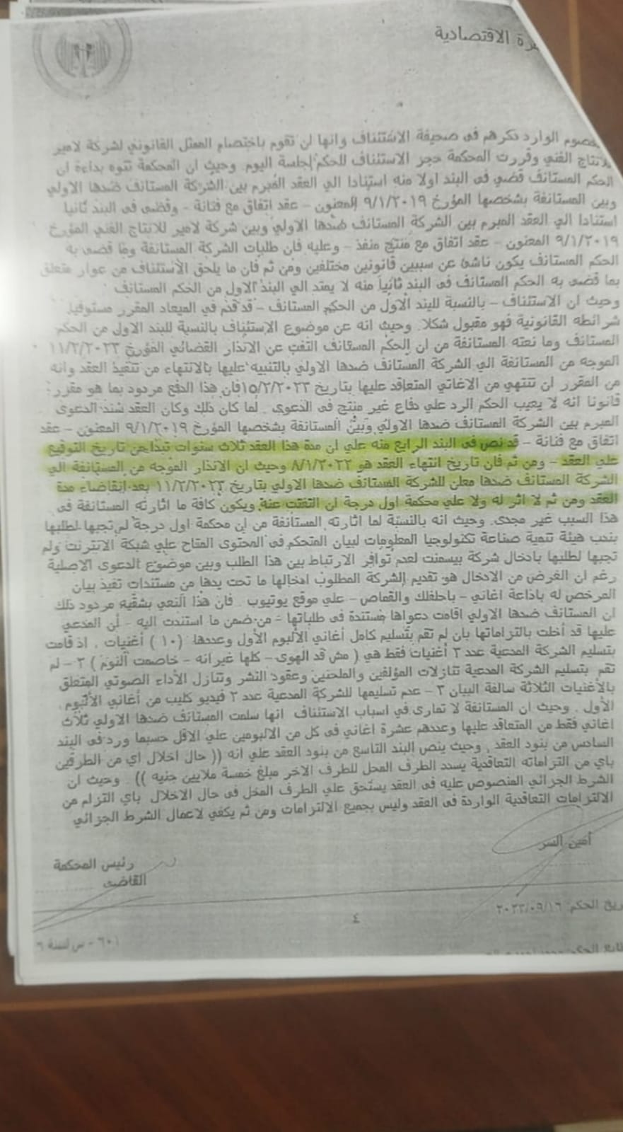وأوضح قنطوش أن الفنانة شيرين عبد الوهاب تعاقدت مع روتانا في شهر يناير عام 2019 بموجب عقد رسمي مدته ثلاث سنوات تبدأ مع توقيع العقد وتنتهي في يناير عام 2022، وأن البند الرابع من العقد نص على ذلك بالتحديد، الأمر الذي يُنهي أي قضية أو دعوى قضائية من جهة روتانا ضد موكلته، ومن ثم لا أثر ولا على المحكمة أن تلتفت له.