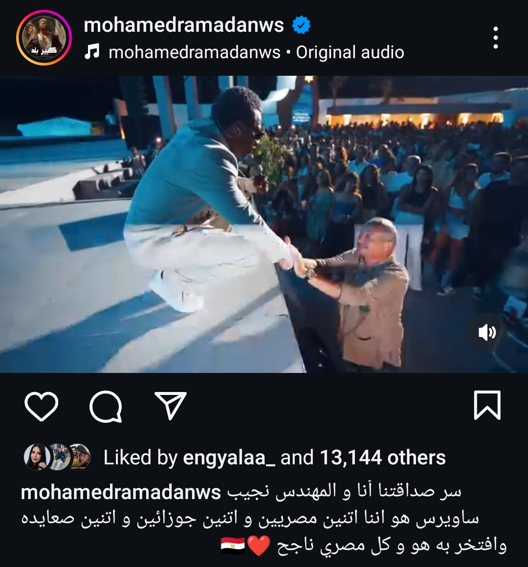 نشر محمد رمضان مقطع فيديو على صفحته الرسمية عبر موقع تبادل الصور والفيديوهات "إنستجرام" وعلق قائلا : "سر صداقتنا أنا والمهندس نجيب ساويرس هو إننا اتنين مصريين واتنين جوزائيين واتنين صعايدة وأفتخر به هو وكل مصري ناجح".
