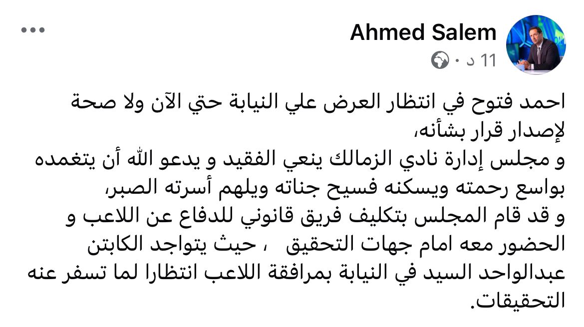 وقال سالم في تدوينة له على فيس بوك : قد قام المجلس بتكليف فريق قانوني للدفاع عن اللاعب و الحضور معه امام جهات التحقيق، حيث يتواجد الكابتن عبدالواحد السيد في النيابة بمرافقة اللاعب انتظارا لما تسفر عنه التحقيقات.