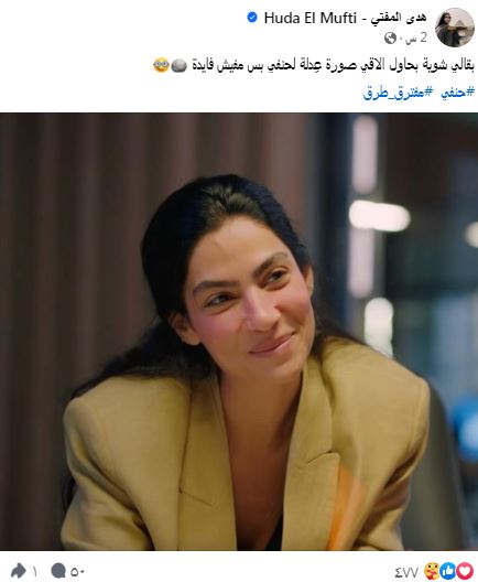 روجت الفنانة هدى المفتي، لشخصيتها من مسلسل «مفترق طرق»، بطولة الفنانة هند صبري، والذي يعرض حاليا عبر منصة «شاهد» الرقمية، ويحقق نجاحا كبيرا.