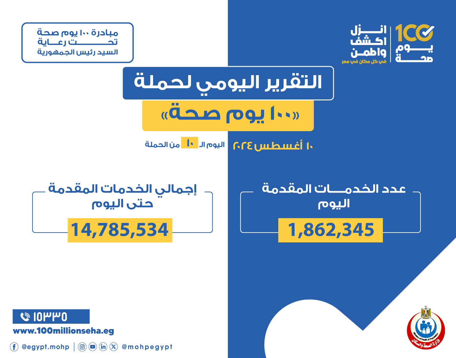 أعلن الدكتور خالد عبدالغفار نائب رئيس مجلس الوزراء ووزير الصحة والسكان، تقديم 14 مليون و785 ألفا و534 خدمة طبية من خلال حملة «100 يوم صحة» منذ إطلاق الدكتور مصطفى مدبولي رئيس مجلس الوزراء، للنسخة الثانية، مساء يوم 31 يوليو 2024، وحتى مساء أمس السبت 10 أغسطس، في جميع محافظات الجمهورية، برعاية السيد الرئيس عبدالفتاح السيسي.