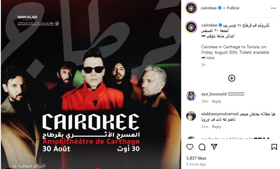 شاركت الصفحة الرسمية لمهرجان قرطاج عبر موقع التواصل الاجتماعي “إنستجرام”، للحفل، وكتبت: “كايروكي في قرطاج تونس يوم الجمعة 30 أغسطس، التذاكر متاحة دلوقتي”.