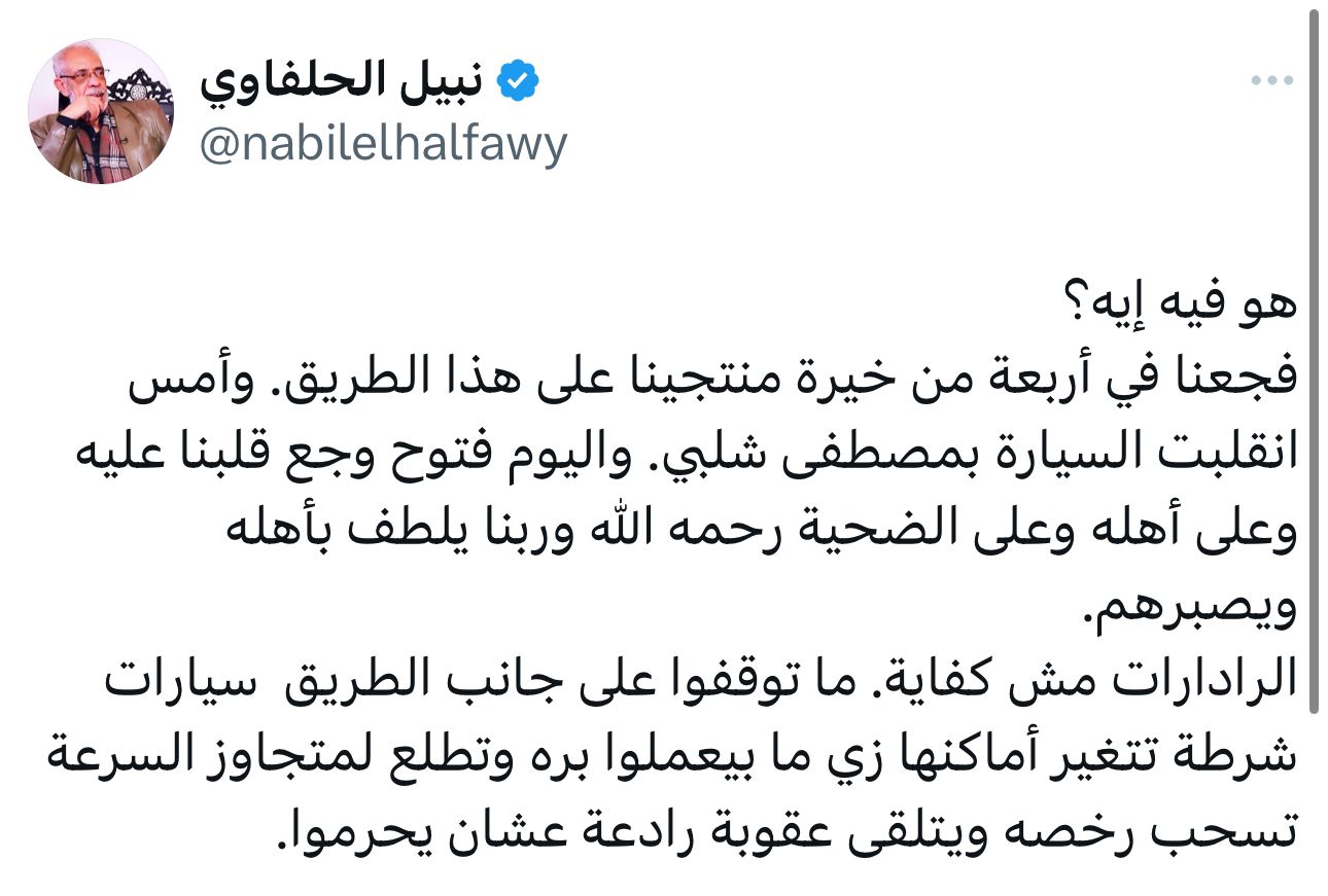 وقال نبيل الحلفاوى بعد حادث مصطفى شلبي وفتوح: “الرادارات مش كفاية ما توقفوا على جانب الطريق سيارات شرطة”.
