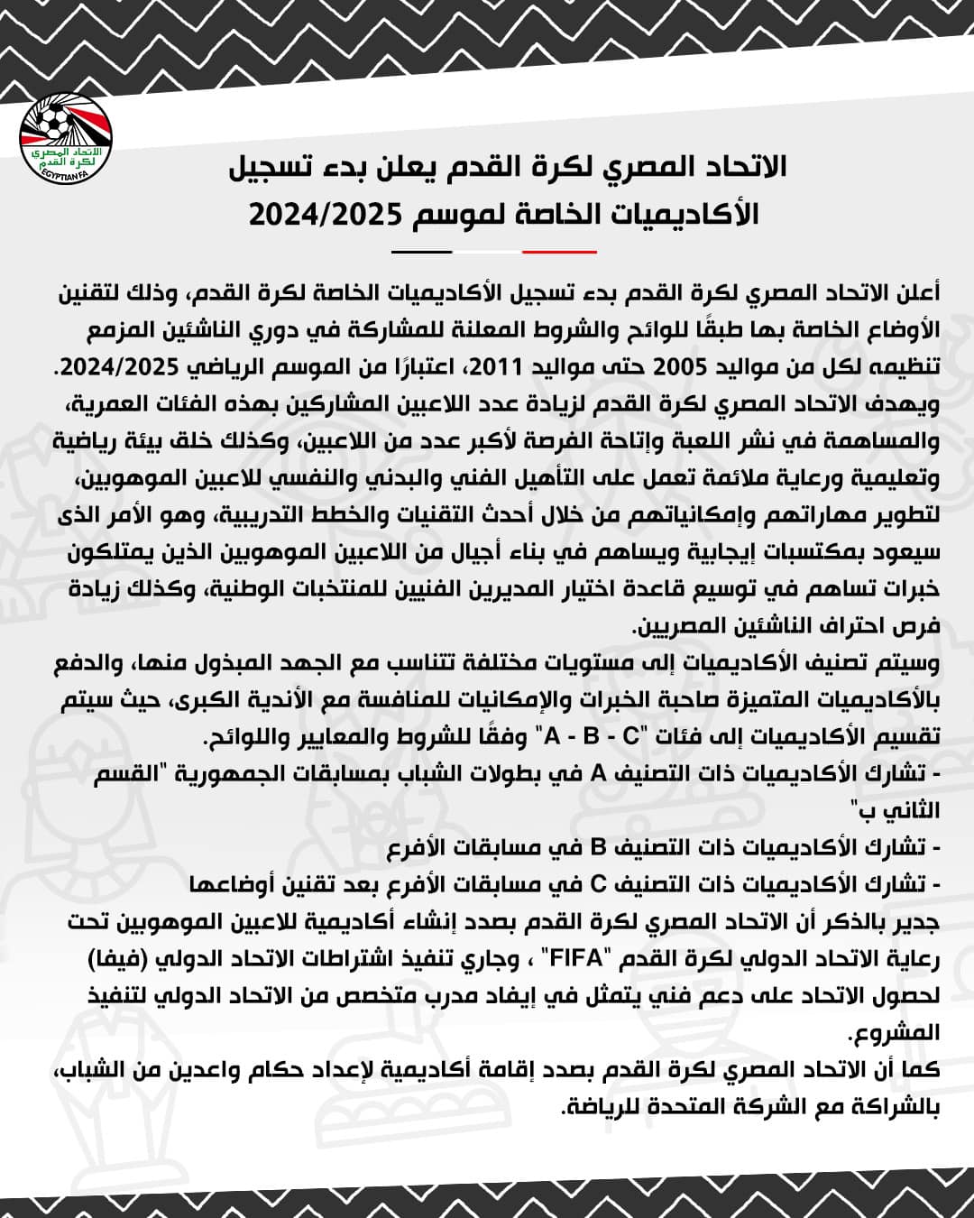 أعلن الاتحاد المصري لكرة القدم بدء تسجيل الأكاديميات الخاصة لكرة القدم، وذلك لتقنين الأوضاع الخاصة بها طبقًا للوائح والشروط المعلنة للمشاركة في دوري الناشئين المزمع تنظيمه لكل من مواليد 2005 حتى مواليد 2011 ، اعتبارًا من الموسم الرياضي 2024/2025.
