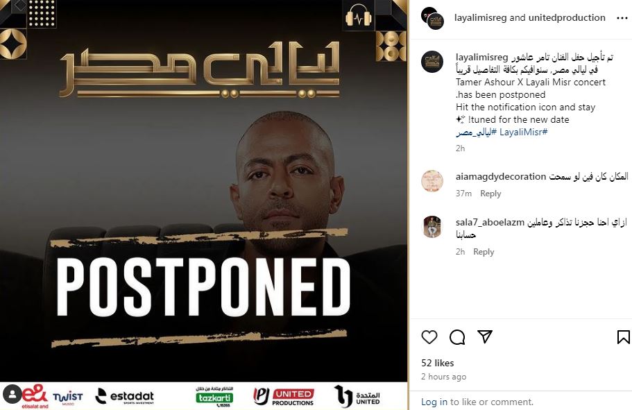 أعلنت الجهة المنظمة، عبر الصفحة الرسمية لمشروع ليالي مصر، في موقع فيسبوك، عن التأجيل، وكتبت: "تم تأجيل حفل الفنان تامر عاشور في ليالي مصر, سنوافيكم بكافة التفاصيل قريباً"