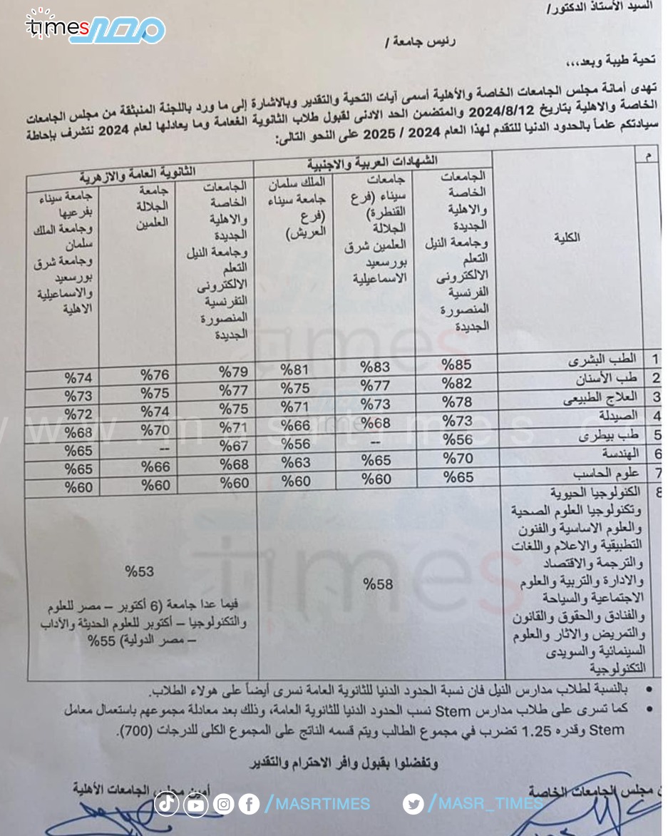 أعلن مجلس الجامعات الخاصة والاهلية بتاريخ 12/8/2024رسميا الحد الأدني لقبول طلاب الثانوية العامة وما يعادلها لعام 2024