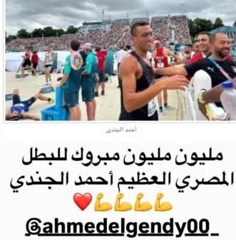 ونشر تامر حسني ستوري عبر حسابه بموقع تبادل الصور والفيديوهات «إنستجرام» صورة لـ البطل المصري أحمد الجندي، معلقا عليها: «مليون مليون مبروك للبطل المصري العظيم أحمد الجندي».