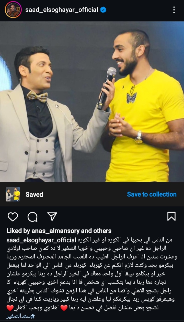 دعم المطرب سعد الصغير لاعب النادي الأهلي كهربا عبر صفحته الرسمية " إنستجرام" ونشر صورة له مع كهربا علق عليها " من الناس اللي بحبها في الكورة وغير الكورة الراجل دةغير انه صاحبي وحبيبي وأخويا الصغير لا دا كمان صاحب أولادي .