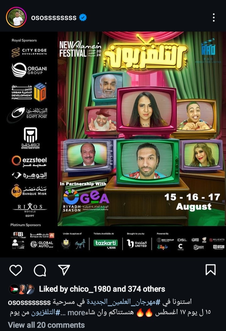 وشارك أوس أوس متابعيه عبر موقع تبادل الصور،والفيديوهات "إنستجرام" بالبوستر الدعائي للمسرحية، وعلق عليه قائلا: "أستنونا في مهرجان العلمين الجديدة في مسرحية التليفزيون.. هنستناكم وإن شاء الله تتبسطوا، العالم علمين"