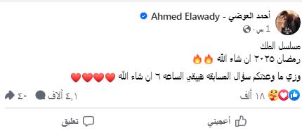 أعلن الفنان أحمد العوضي تحضيره لمسلسل رمضان 2025، وكتب الفنان أحمد العوضي عبر حسابه الشخصي"فيس بوك"، «مسلسل الملك رمضان 2025 إن شاء الله، وزي ما وعدتكم سؤال المسابقة هيبقي الساعه 6 إن شاء الله» .
