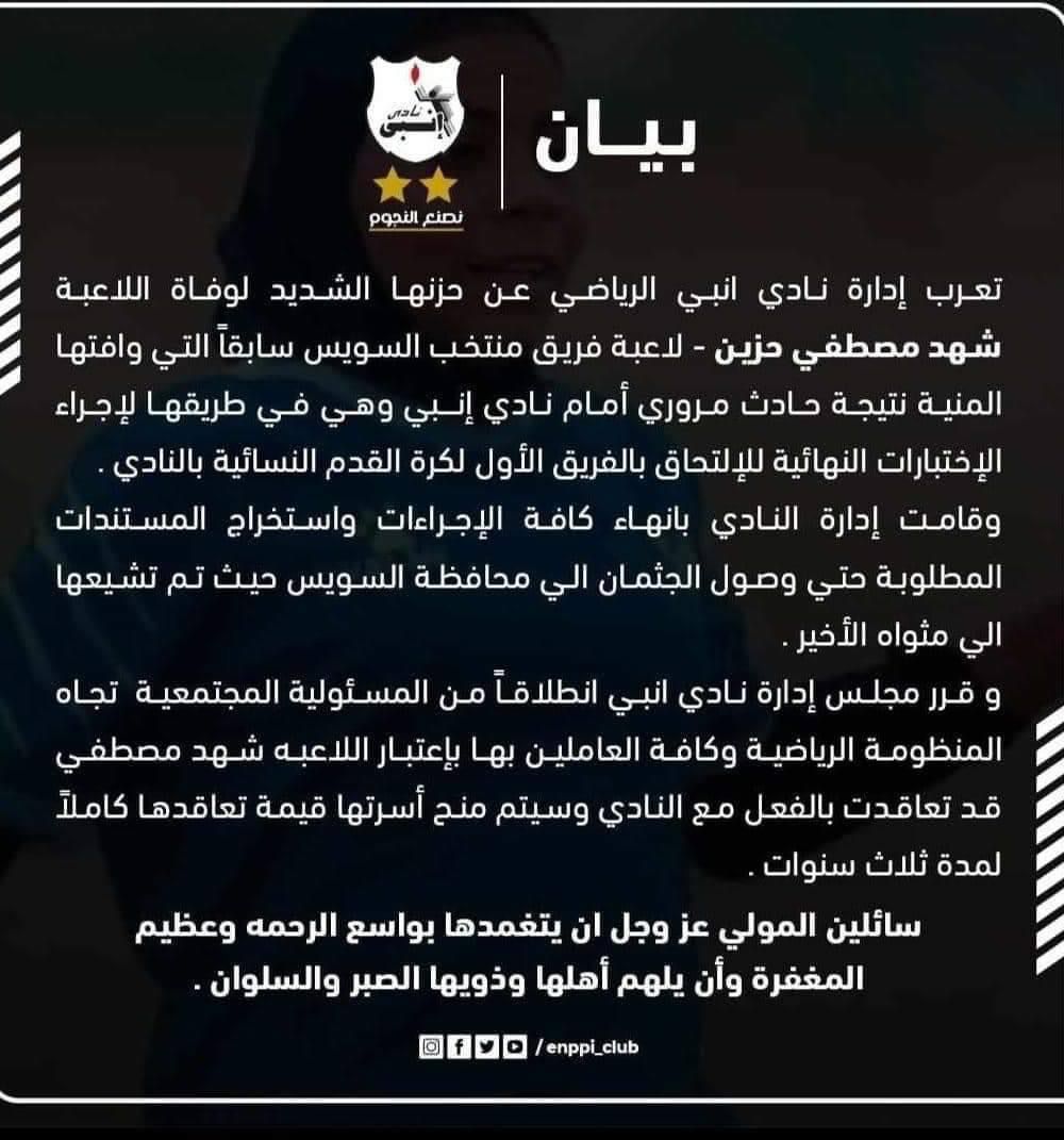 نشر حساب نادي إنبي عبر موقع التواصل الاجتماعي بيان، يعبر فيه عن حزنه الشديد في وفاة لاعب منتخب السويس شهد مصطفى، وقرر المسئولين منح أسرتها قيمة تعاقدها كاملاً.