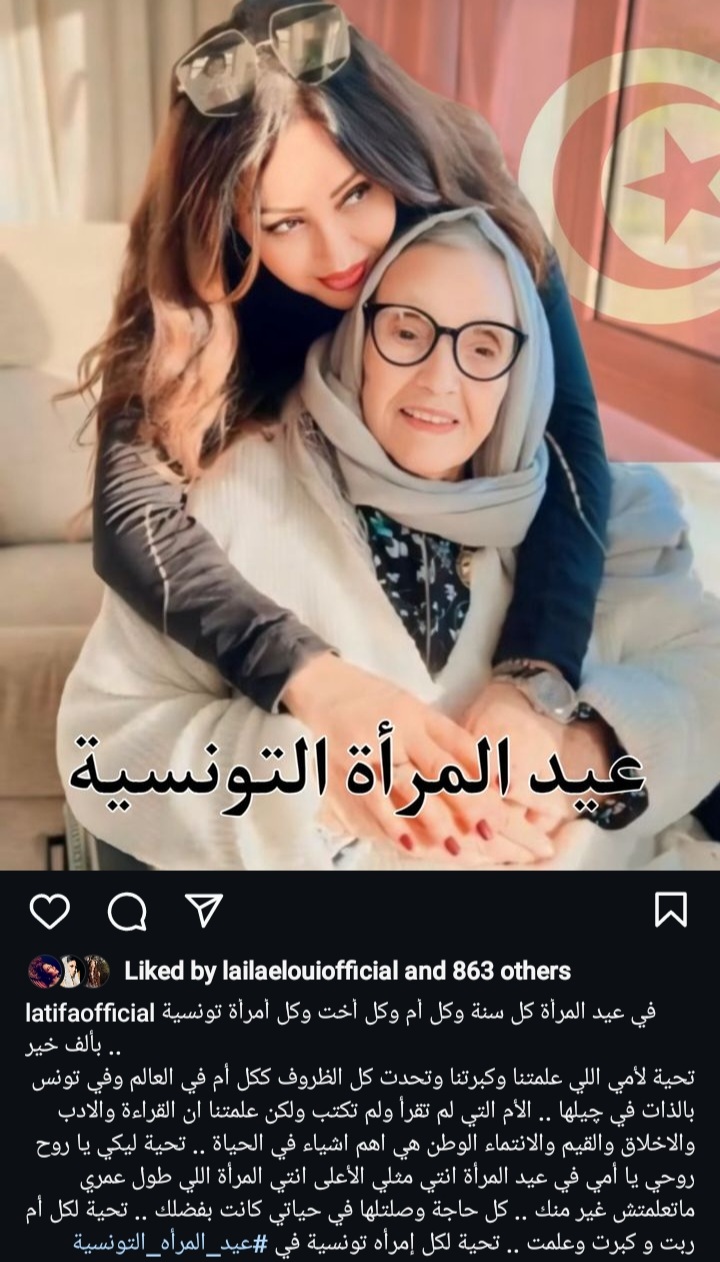 وجهت النجمة التونسية لطيفة رسالة لوالدتها في عيد المرأة التونسية عبر صفحتها الرسمية " إنستجرام"حيث نشرت صورة تجمعها بوالدتها وعلقت "كل سنة وكل أم وكل أخت وكل أمرأة تونسية بألف خير، تحية لأمي اللي علمتنا وكبرتنا وتحدت كل الظروف ككل أم في العالم وفي تونس بالذات في چيلها.