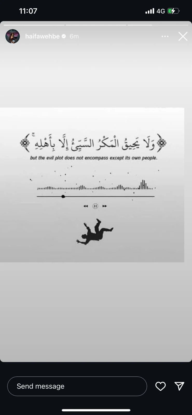وقالت هيفاء وهبي عبر خاصية الاستوري عبر حسابها الرسمي بموقع تبادل الصور والفيديوهات إنستجرام، نص الآية القرآنية الكريمة: ولا يحيق المكر السيئ إلا بأهله.