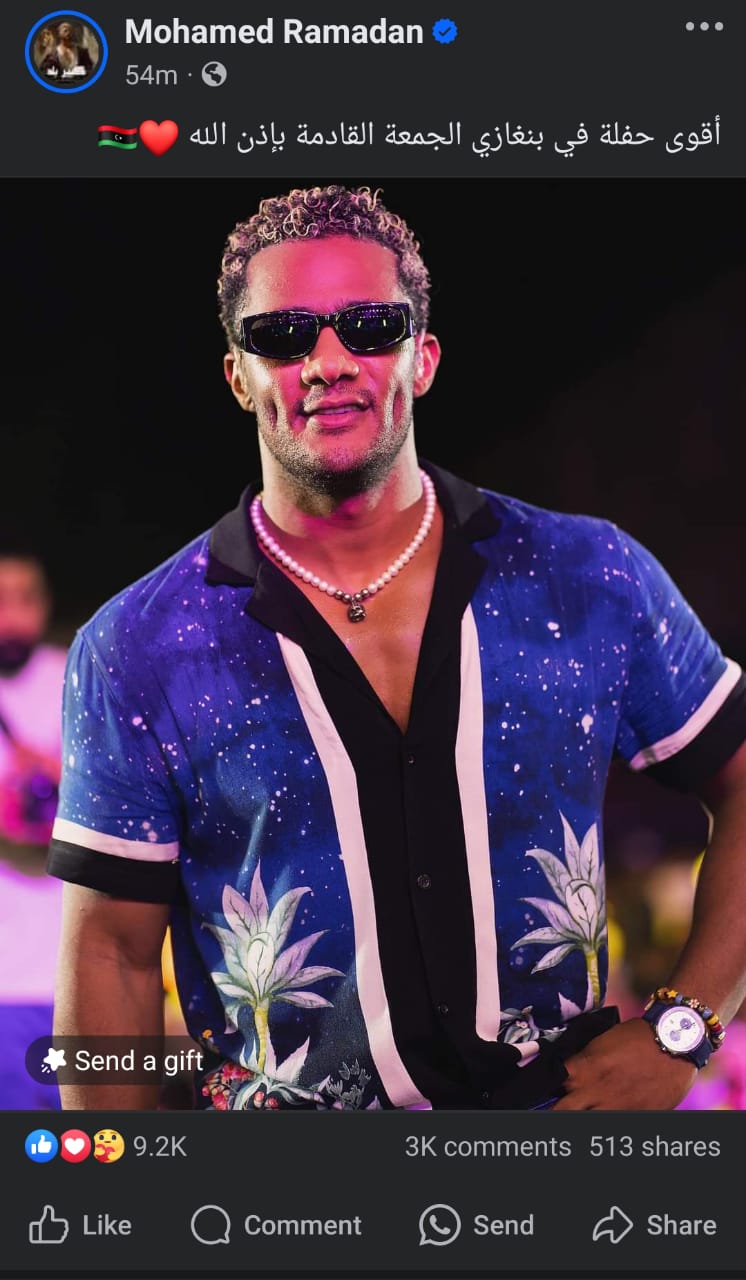 نشر محمد رمضان صورة على صفحته الرسمية عبر موقع التواصل الاجتماعي "فيسبوك" مروجا للحفل وعلق قائلا : "أقوى حفلة في بني غازي الجمعة القادمة بإذن الله".