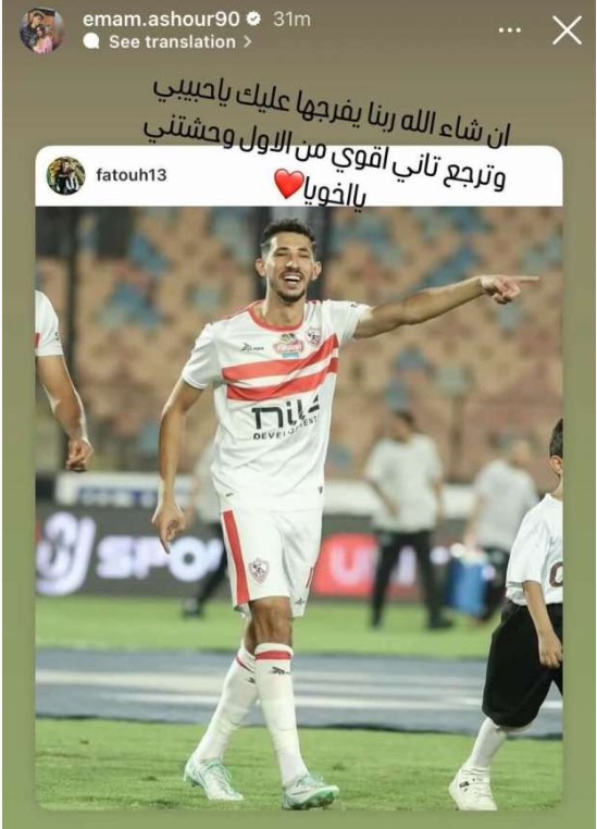 وكتب إمام عاشور عبر حسابه بموقع التواصل الاجتماعي انستجرام : “إن شاء الله ربنا يفرجها عليك يا حبيبي وترجع تاني أقوى من الأول”.