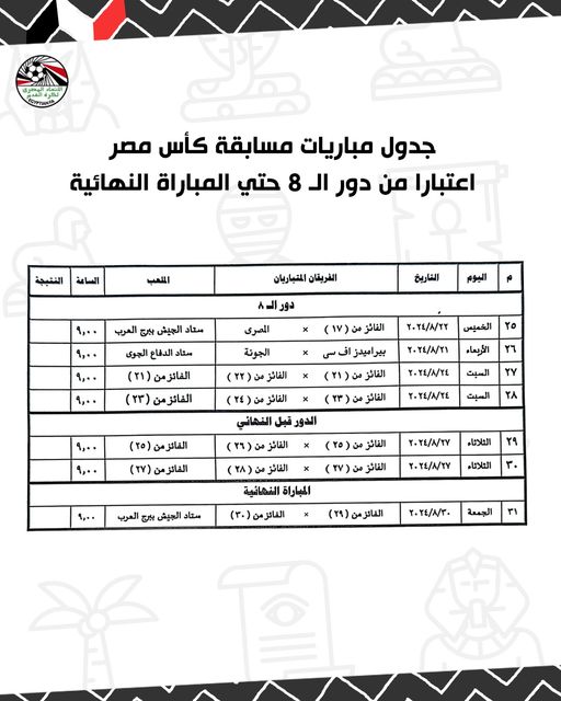 كشفت إدارة المسابقات باتحاد الكرة، مواعيد مباريات الأدوار النهائية لكأس مصر، والمباراة النهائية يوم 30 أغسطس الجاري باستاد برج العرب بالإسكندرية .
