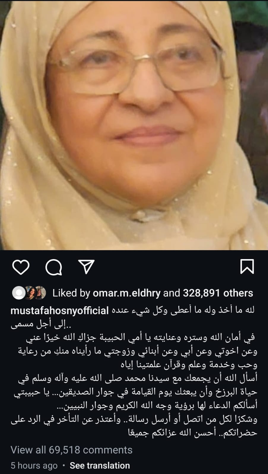 وعلق مصطفى حسني قائلا : "لله ما أخذ وله ما أعطى وكل شئ عنده إلى أجل غير مسمى .. في أمان الله وستره وعنايته يا أمي الحبيبة جزاك الله خيرا عني وعن اخوتي وعن أبي وعن أبنائي وزوجتي ما رأيناه منك من رعاية وحب وخدمة وعلم وقرآن علمتينا إياه".