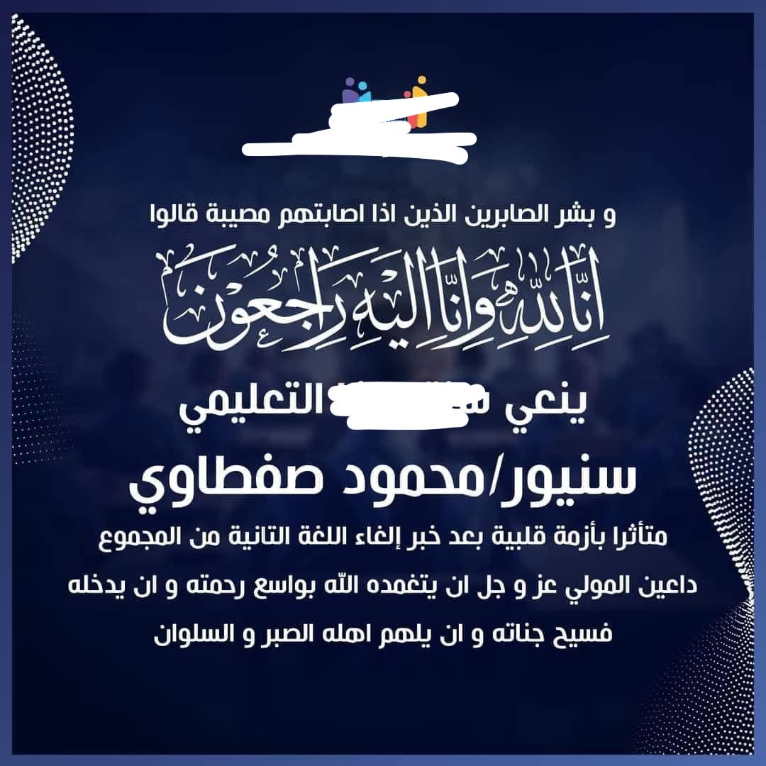 ونعى سنتر تعليمى رحيل المدرس محمود صفطاوى، متأثراً بأزمة قلبية بعد خبر إلغاء اللغة الثانية من المجموع، كما نعاه عدد من المدرسين على مواقع التواصل الاجتماعى.