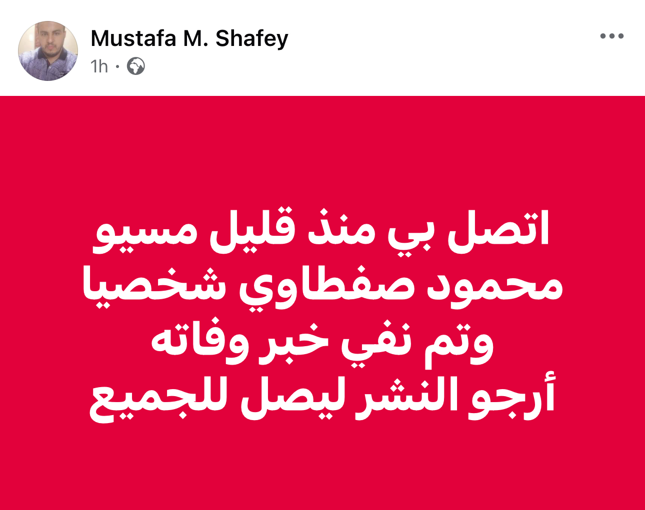 وقال الشافعي في منشور عبر صفحته على موقع التواصل الاجتماعي “فيس بوك”: "اتصل بي منذ قليل مسيو محمود صفطاوي شخصيا، وتم نفي خبر وفاته.. أرجو النشر ليصل للجميع".