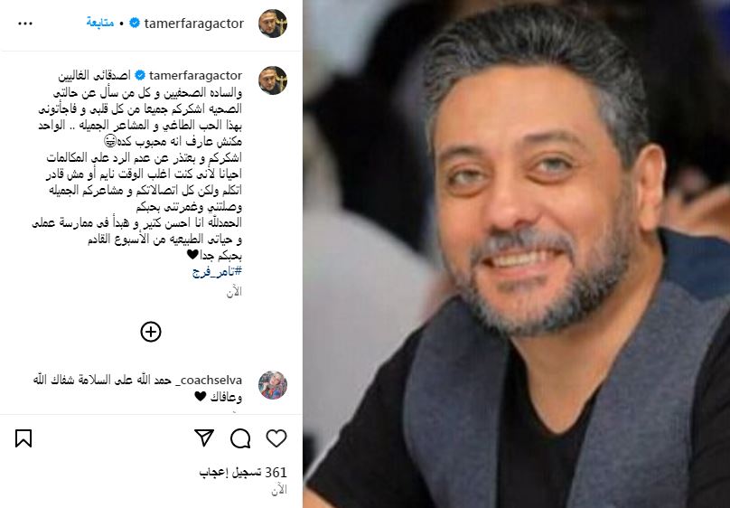 وأضاف تامر فرج: "الحمد لله أنا أحسن كتير وهبدأ في ممارسة عملي وحياتي الطبيعية من الأسبوع القادم.. بحبكم جدا".