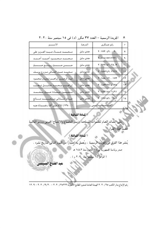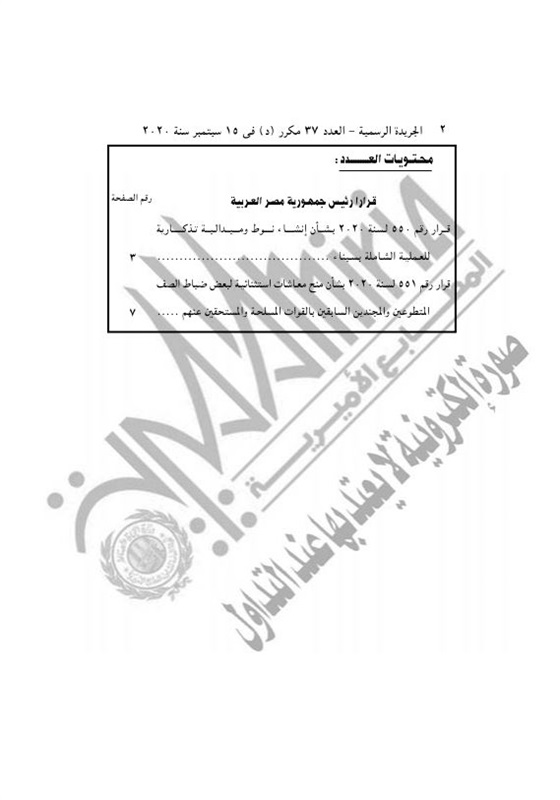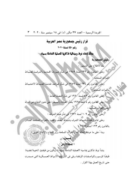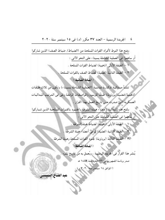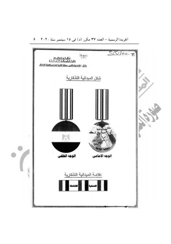 ونشرت الجريدة الرسمية تصديق القرار الجمهورى رقم 550 لسنة 2020، بشأن إنشاء نوط تذكارى بمناسبة "العملية الشاملة بسيناء"، ويتكون من طبقتين ذهبية أو فضية.