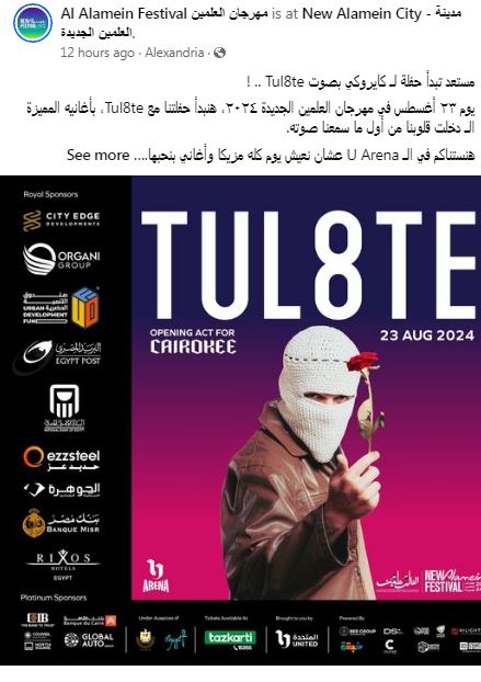 كما أعلنت الصفحة الرسمية لمهرجان العلمين في دورته الثانية عن إحياء حفل كايروكي وتوليت ضمن فعاليات مهرجان العلمين، وذلك بعدما تصدر المطرب الشاب توليت محركات البحث الاجتماعي الأيام .