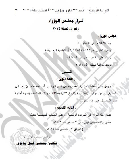 نشرت الجريدة الرسمية في عددها رقم 32 مكرر (د)، الصادر في 12 أغسطس لسنة 2024، قرار مجلس الوزراء رقم 44 لسنة 2024، بشأن إسقاط الجنسية المصرية عن المخرج وائل أسامة عثمان عباس الصديقي.